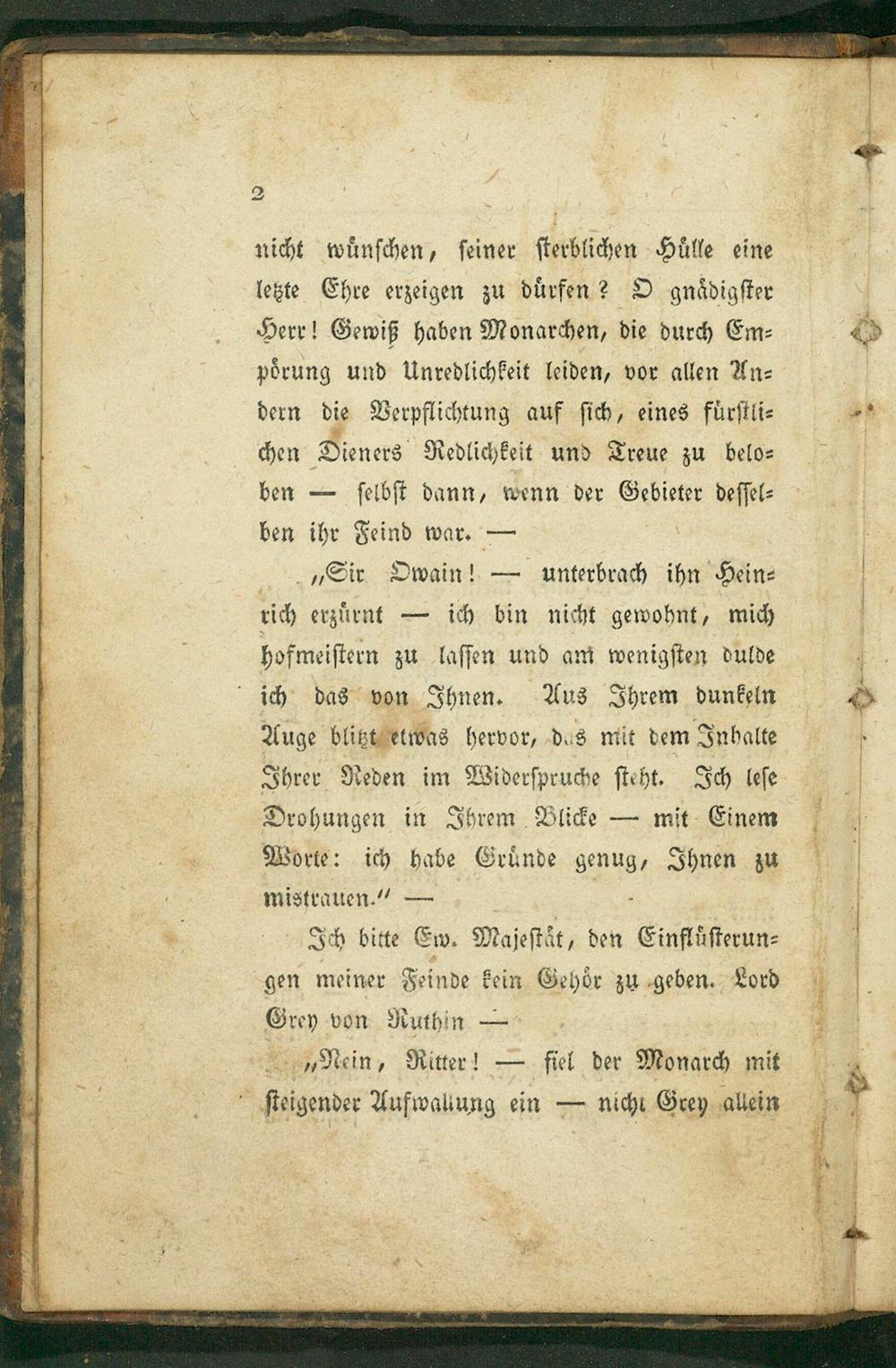 „Sir Owain!— unterbrach ihn Hein⸗ rich erzuͤrnt— ich bin nicht gewohnt, mich hofmeiſtern zu laſſen und am wenigſten dulde ich das von Ihnen. Aus Ihrem dunkeln Auge blitzt etwas hervor, das mit dem Inhalte Ihrer Reden im Widerſpruche ſteht. Ich leſe Drohungen in Ihrem Blicke— mit Einem Worte: ich habe Gruͤnde genug, Ihnen zu mistrauen.“—