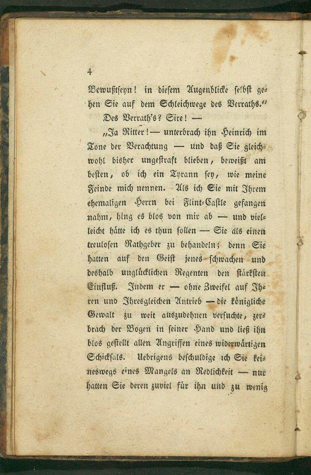 „Ja Ritter!— unterbrach ihn Heinrich im Tone der Verachtung— und daß Sie gleich⸗ wohl bisher ungeſtraft blieben, beweißt am beſten, ob ich ein Tyrann ſey, wie meine Feinde mich nennen. Als ich Sie mit Ihrem ehemaligen Herrn bei Flint⸗Caſtle gefangen nahm, hing es blos von mir ab— und viel⸗ leicht haͤtte ich es thun ſollen— Sie als einen treuloſen Rathgeber zu behandeln; denn Sie hatten auf den Geiſt jenes ſchwachen und