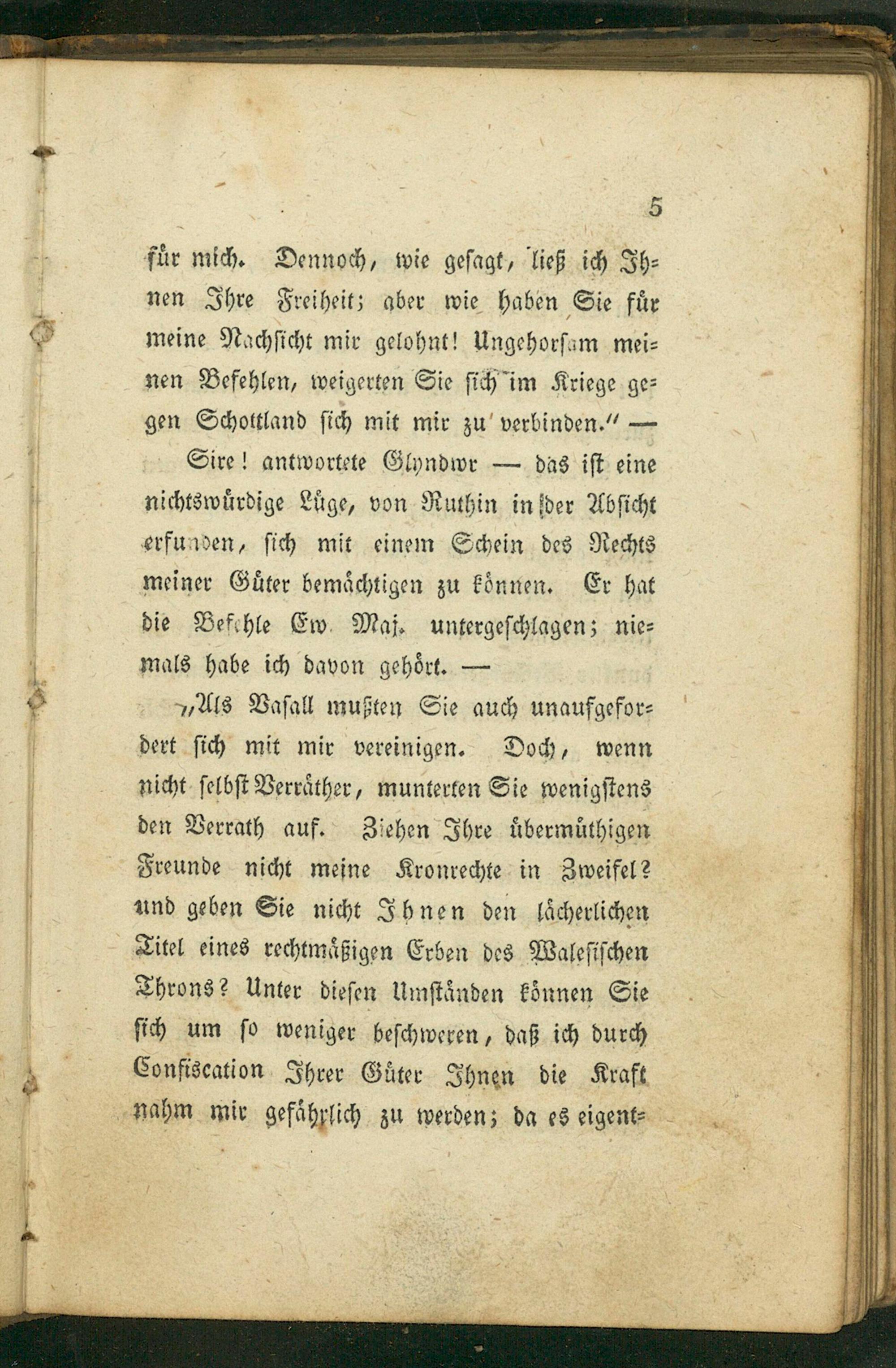 „,Als Vaſall mußten Sie auch unaufgefor⸗ dert ſich mit mir vereinigen. Doch, wenn nicht ſelbſt Verraͤther, munterten Sie wenigſtens den Verrath auf. Ziehen Ihre uͤbermuͤthigen Freunde nicht meine Kronrechte in Zweifel? und geben Sie nicht Ihnen den laͤcherlichen Titel eines rechtmaͤßigen Erben des Waleſiſchen Throns? Unter dieſen Umſtaͤnden koͤnnen Sie ſich um ſo weniger beſchweren, daß ich durch Confiscation Ihrer Guͤter Ihnen die Kraft