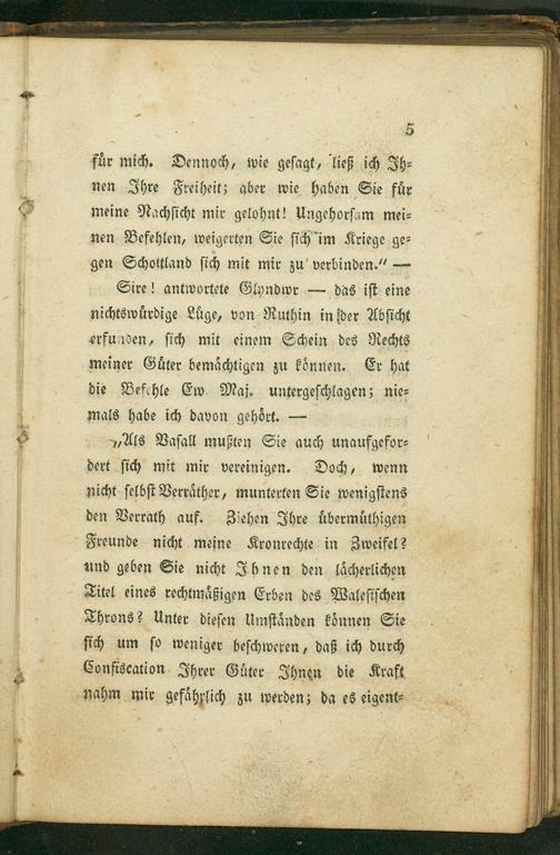 Sire! antwortete Glyndwr— das iſt eine nichtswuͤrdige Luͤge, von Ruthin in ſder Abſicht erfunden, ſich mit einem Schein des Rechts meiner Guͤter bemaͤchtigen zu koͤnnen. Er hat die Befehle Ew. Maj. untergeſchlagen; nie⸗ mals habe ich davon gehoͤrt.—