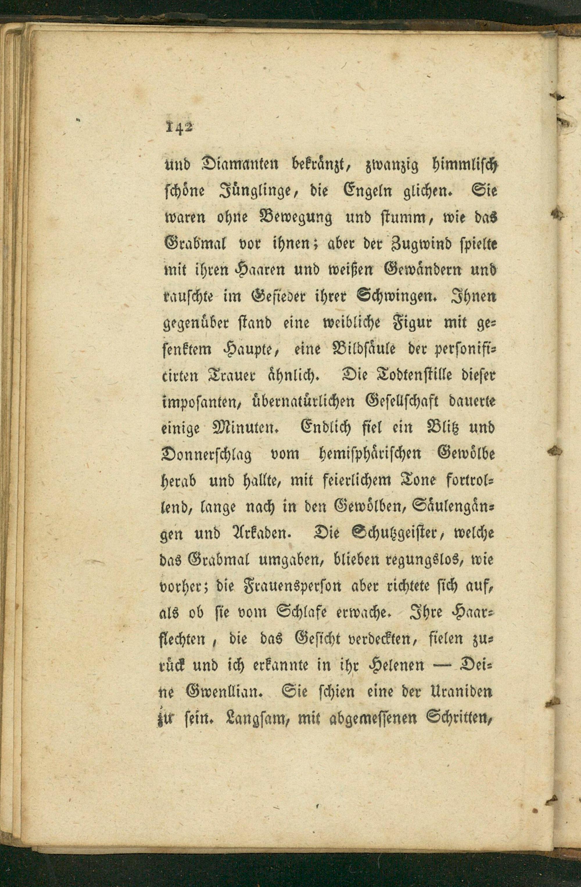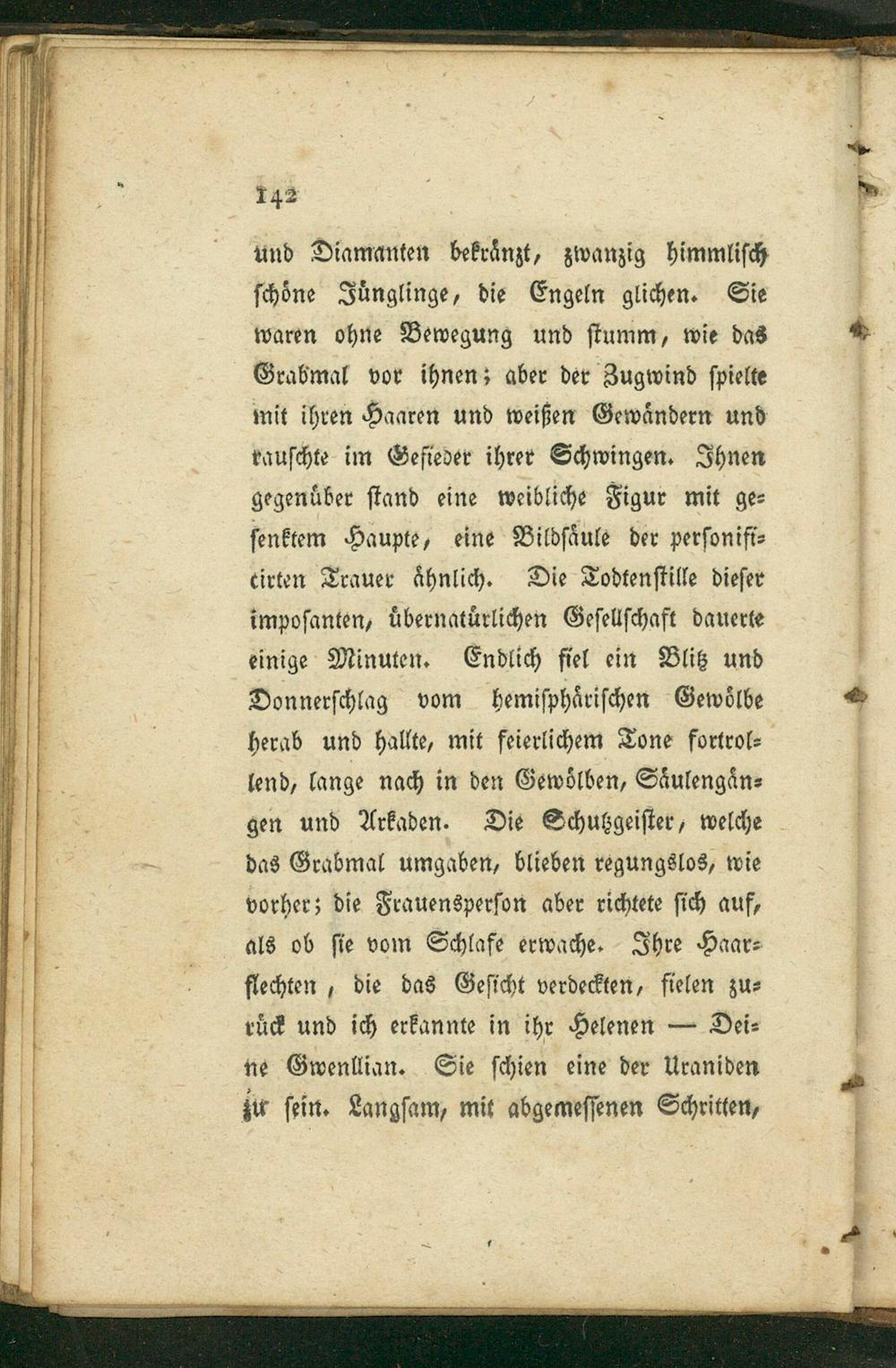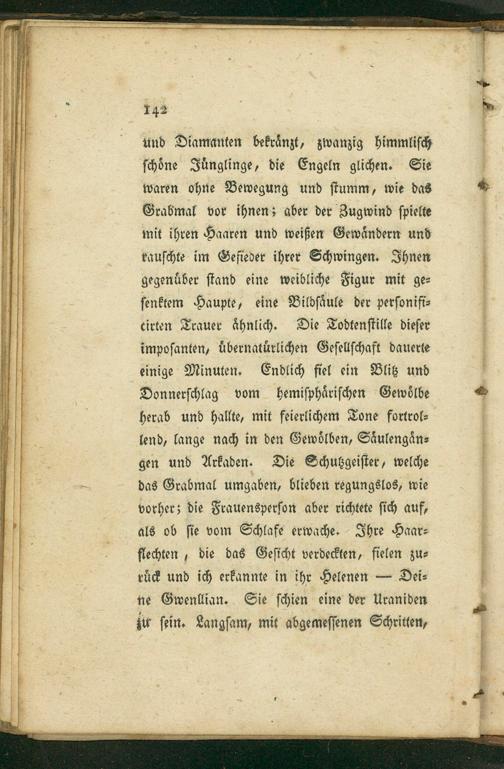 und Diamanten bekraͤnzt, zwanzig himmliſch ſchoͤne Juͤnglinge, die Engeln glichen. Sie waren ohne Bewegung und ſtumm, wie das Grabmal vor ihnen; aber der Zugwind ſpielte mit ihren Haaren und weißen Gewaͤndern und rauſchte im Gefieder ihrer Schwingen. Ihnen gegenuͤber ſtand eine weibliche Figur mit ge⸗ ſenktem Haupte, eine Bildſaͤule der perſonifi⸗ cirten Trauer aͤhnlich. Die Todtenſtille dieſer impoſanten, uͤbernatuͤrlichen Geſellſchaft dauerte einige Minuten. Endlich fiel ein Blitz und Donnerſchlag vom hemiſphaͤriſchen Gewoͤlbe herab und hallte, mit feierlichem Tone fortrol⸗ lend, lange nach in den Gewoͤlben, Saͤulengaͤn⸗ gen und Arkaden. Die Schutgeiſter, welche das Grabmal umgaben, blieben regungslos, wie vorher; die Frauensperſon aber richtete ſich auf,