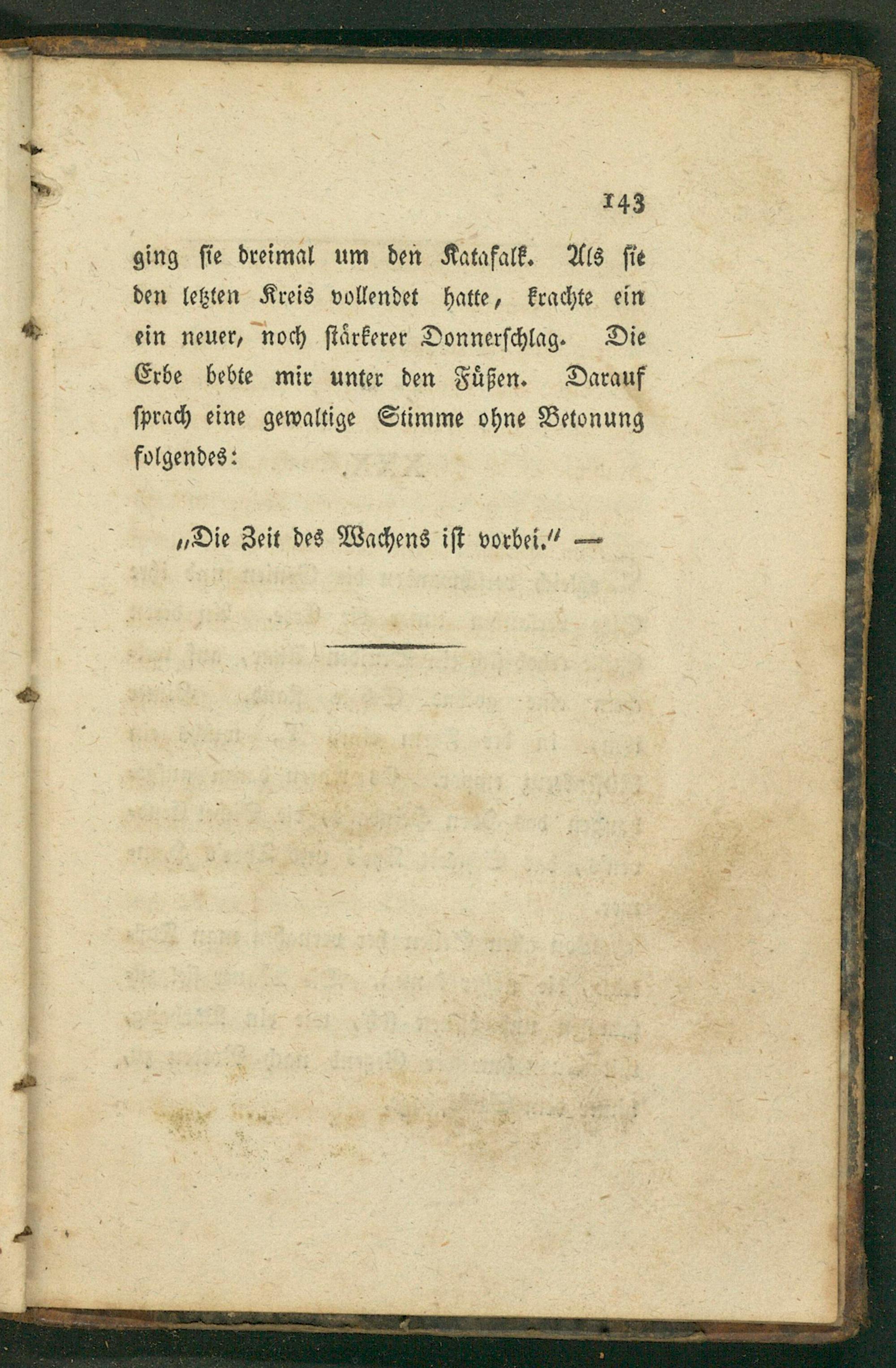 ging ſie dreimal um den Katafalk. Als ſie den letzten Kreis vollendet hatte, krachte ein ein neuer, noch ſtaͤrkerer Donnerſchlag. Die Erbe bebte mir unter den Fuͤßen. Darauf ſprach eine gewaltige Stimme ohne Betonung folgendes: