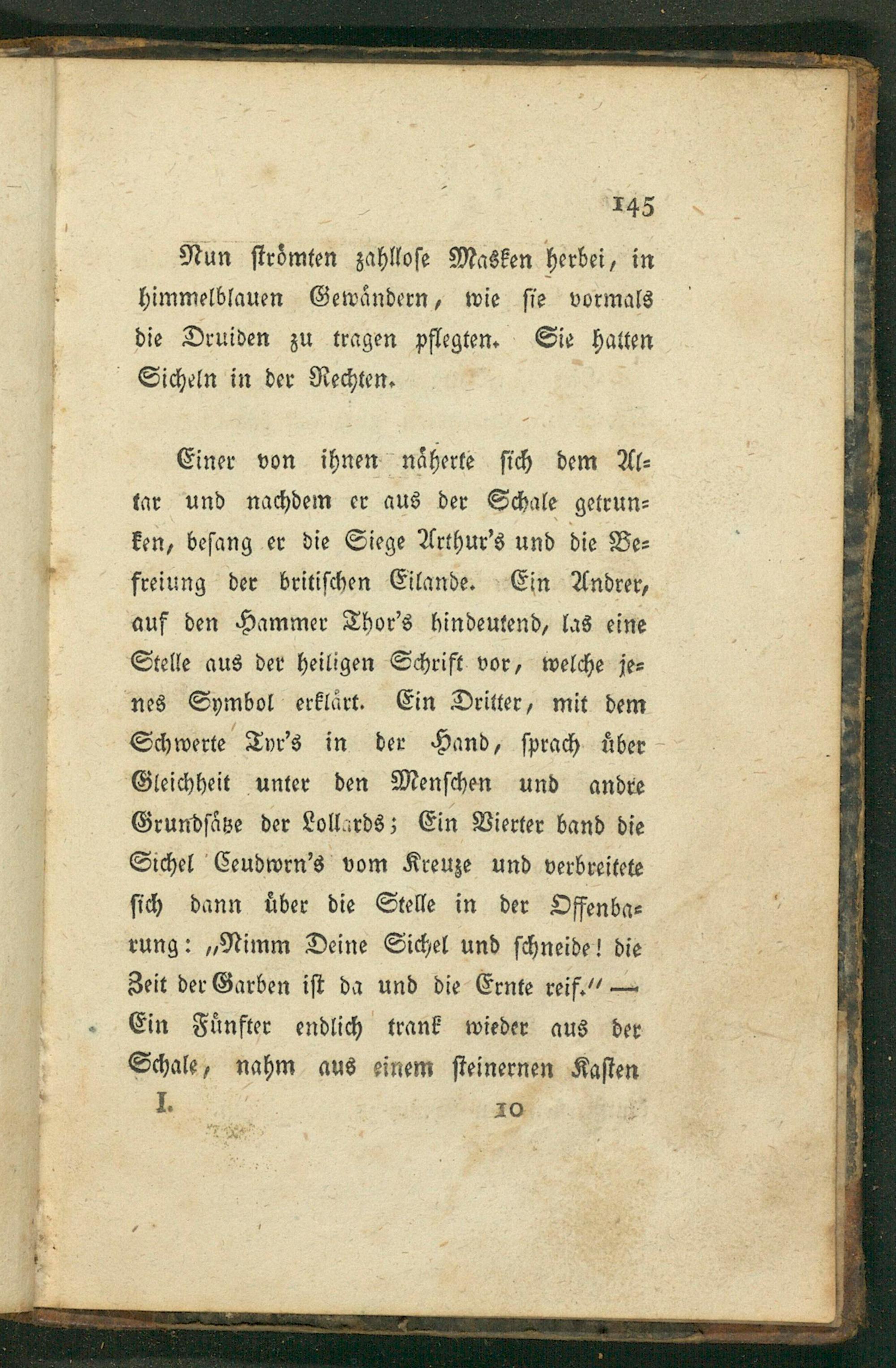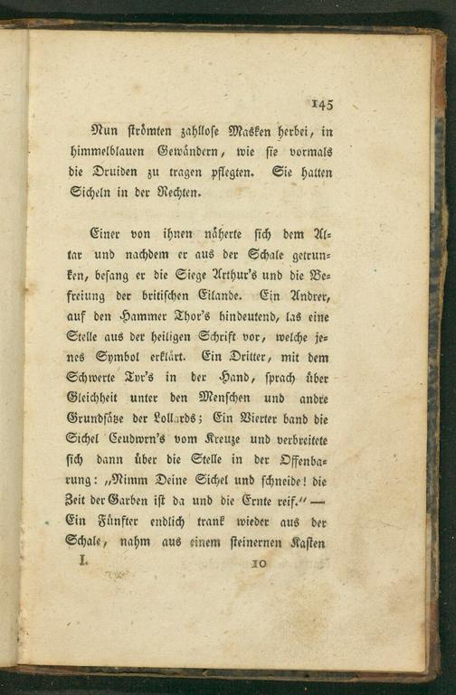 Einer von ihnen naͤherte ſich dem Al⸗ tar und nachdem er aus der Schale getrun⸗ ken, beſang er die Siege Arthur's und die Be⸗ freiung der britiſchen Eilande. Ein Andrer, auf den Hammer Thor's hindeutend, las eine Stelle aus der heiligen Schrift vor, welche je⸗ nes Symbol erklaͤrt. Ein Dritter, mit dem Schwerte Tyr's in der Hand, ſprach uͤber Gleichheit unter den Menſchen und andre Grundſaͤtze der Lollards; Ein Vierter band die Sichel Ceudwrn's vom Kreuze und verbreitete ſich dann uͤber die Stelle in der Offenba⸗ rung:„Nimm Deine Sichel und ſchneide! die Zeit der Garben iſt da und die Ernte reif.“— Ein Fuͤnfter endlich trank wieder aus der Schale, nahm aus einem ſteinernen Kaſten