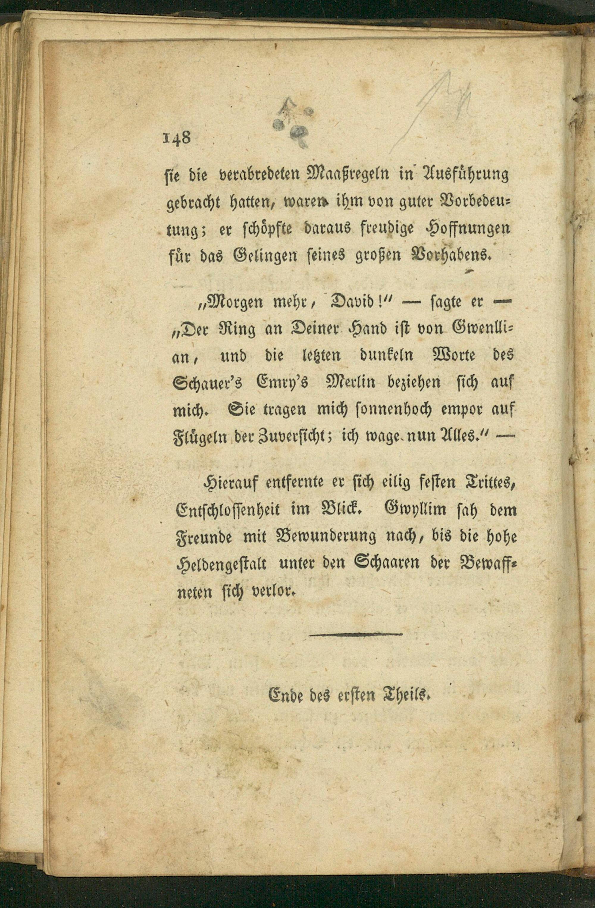 „Morgen mehr, David!“— ſagte er— „Der Ring an Deiner Hand iſt von Gwenlli⸗ an, und die letzten dunkeln Worte des Schauer's Emry's Merlin beziehen ſich auf 1 mich. Sie tragen mich ſonnenhoch empor auf Fluͤgeln der Zuverſicht; ich wage nun Alles.“—