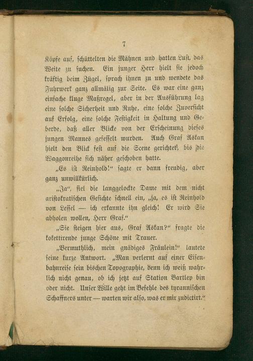 Köpfe auf, ſchüttelten die Mähnen und hatten Luſt, das Weite zu ſuchen. Ein junger Herr hielt ſie jedoch kräftig beim Zügel, ſprach ihnen zu und wendete das Fuhrwerk ganz allmälig zur Seite. Es war eine ganz einfache kluge Maßregel, aber in der Ausführung lag eine ſolche Sicherheit und Ruhe, eine ſolche Zuverſicht auf Erfolg, eine ſolche Feſtigkeit in Haltung und Ge⸗ berde, daß aller Blicke von der Erſcheinung dieſes jungen Mannes gefeſſelt wurden. Auch Graf Askan hielt den Blick feſt auf die Scene gerichtet, bis die Waggonreihe ſich näher geſchoben hatte.