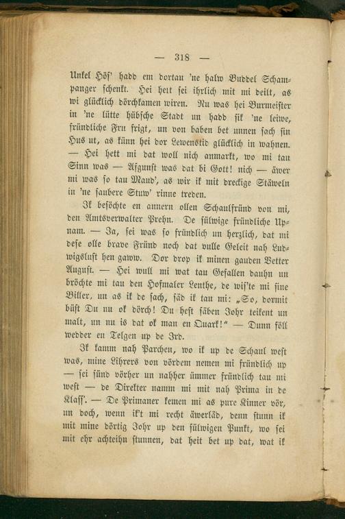Ik kamm nah Parchen, wo ik up de Schaul weſt was, mine Lihrers von vördem nemen mi fründlich up — ſei ſünd vörher un nahher ümmer fründlich tau mi weſt— de Direkter namm mi mit nah Prima in de Klaſſ.— De Primaner kemen mi as pure Kinner vör, un doch, wenn ik't mi recht äwerläd, denn ſtunn ik mit mine dörtig Johr up den fülwigen Punkt, wo ſei mit ehr achteihn ſtunnen, dat heit bet up dat, wat ik