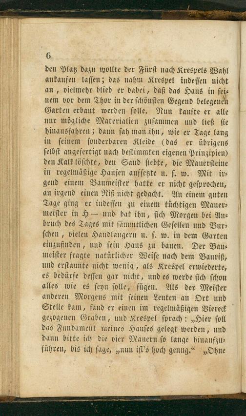 den Platz dazu wollte der Fürſt nach Krespels Wahl ankaufen laſſen; das nahm Krespel indeſſen nicht an, vielmehr blieb er dabei, daß das Haus in ſei⸗ nem vor dem Thor in der ſchönſten Gegend belegenen Garten erbaut werden ſolle. Nun kaufte er alle nur mögliche Materialien zuſammen und ließ ſie hinausfahren; dann ſah man ihn, wie er Tage lang in ſeinem ſonderbaren Kleide(das er übrigens ſelbſt angefertigt nach beſtimmten eigenen Prinzipien) den Kalk löſchte, den Sand ſiebte, die Mauerſteine in regelmäßige Haufen aufſetzte u. ſ. w. Mit ir⸗ gend einem Baumeiſter hatte er nicht geſprochen, an irgend einen Riß nicht gedacht. An einem guten Tage ging er indeſſen zu einem tüchtigen Mauer⸗ meiſter in H— und bat ihn, ſich Morgen bei An⸗ bruch des Tages mit ſämmtlichen Geſellen und Bur⸗ ſchen, vielen Handlangern u. ſ. w. in dem Garten einzufinden, und ſein Haus zu bauen. Der Bau⸗ meiſter fragte natürlicher Weiſe nach dem Bauriß, und erſtaunte nicht wenig, als Krespel erwiederte, es bedürfe deſſen gar nicht, und es werde ſich ſchon alles wie es ſeyn ſolle, fügen. Als der Meiſter anderen Morgens mit ſeinen Leuten an Ort und Stelle kam, fand er einen im regelmäßigen Viereck gezogenen Graben, und Krespel ſprach:„Hier ſoll das Fundament meines Hauſes gelegt werden, und dann bitte ich die vier Manern ſo lange hinaufzu⸗ führen, bis ich ſage,„nun iſt's hoch genug.“„Ohne