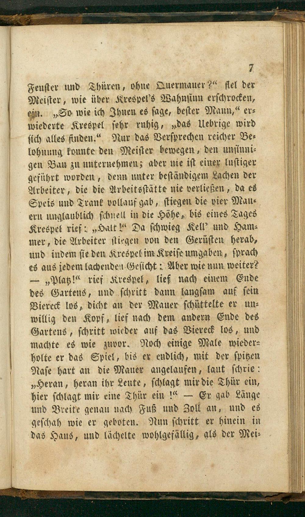 Feuſter und Thüren, ohne Quermauer 2 fiel der Meiſter, wie über Krespel's Wahnſinn erſchrocken, ein.„So wie ich Ihnen es ſage, beſter Mann,“ er⸗ wiederte Krespel ſehr ruhig,„das Uebrige wird ſich alles finden.“ Nur das Verſprechen reicher Be⸗ lohnung konnte den Meiſter bewegen, den unſinni⸗ gen Bau zu unternehmen; aber nie iſt einer luſtiger geführt worden, denn unter beſtändigem Lachen der Arbeiter, die die Arbeitsſtätte nie verließen, da es Speis und Trank vollauf gab, ſtiegen die vier Mau⸗ ern unglaublich ſchnell in die Höhe, bis eines Tages Krespel rief:„Halt Da ſchwieg Kell' und Ham⸗ mer, die Arbeiter ſtiegen von den Gerüſten herab, und indem ſie den Krespel im Kreiſe umgaben, ſprach es aus jedem lachenden Geſicht: Aber wie nun weiter? —„Platz!“ rief Krespel, lief nach einem Ende des Gartens, und ſchritt dann langſam auf ſein Viereck los, dicht an der Mauer ſchüttelte er un⸗ willig den Kopf, lief nach dem andern Ende des Gartens, ſchritt wieder auf das Viereck los, und machte es wie zuvor. Noch einige Male wieder⸗ holte er das Spiel, bis er endlich, mit der ſpitzen Naſe hart an die Mauer angelaufen, laut ſchrie: „Heran, heran ihr Leute, ſchlagt mir die Thür ein, hier ſchlagt mir eine Thür ein!— Er gab Länge und Breite genau nach Fuß und Zoll an, und es geſchah wie er geboten. Nun ſchritt er hinein in das Haus, und lächelte wohlgefällig, als der Mei⸗