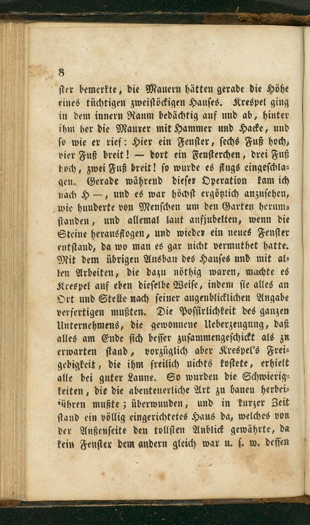 ſter bemerkte, die Mauern hätten gerade die Höhe eines tüchtigen zweiſtöckigen Hauſes. Krespel ging in dem innern Raum bedächtig auf und ab, hinter ihm her die Maurer mit Hammer und Hacke, und ſo wie er rief: Hier ein Fenſter, ſechs Fuß hoch, vier Fuß breit!— dort ein Fenſterchen, drei Fuß hoch, zwei Fuß breit! ſo wurde es flugs eingeſchla⸗ gen. Gerade während dieſer Operation kam ich nach H—, und es war höehſt ergötzlich anzuſehen, wie hunderte von Menſchen um den Garten herum⸗ ſtanden, und allemal lant aufjubelten, wenn die Steine herausflogen, und wieder ein neues Fenſter entſtand, da wo man es gar nicht vermuthet hatte. Mit dem übrigen Ausbau des Hauſes und mit al⸗ len Arbeiten, die dazu nöthig waren, machte es Krespel auf eben dieſelbe Weiſe, indem ſie alles an Ort und Stelle nach ſeiner augenblicklichen Angabe verfertigen mußten. Die Poſſirlichkeit des ganzen Unternehmens, die gewonnene Ueberzeugung, daß alles am Ende ſich beſſer zuſammengeſchickt als zu erwarten ſtand, vorzüglich aber Krespel's Frei⸗ gebigkeit, die ihm freilich nichts koſtete, erhielt alle bei guter Laune. So wurden die Schwierig⸗ keiten, die die abenteuerliche Art zu bauen herbei⸗ sühren mußte; überwunden, und in kurzer Zeit ſtand ein völlig eingerichtetes Haus da, welches von der Außenſeite den tollſten Anblick gewährte, da kein Feuſter dem andern gleich war u. ſ. w. deffen