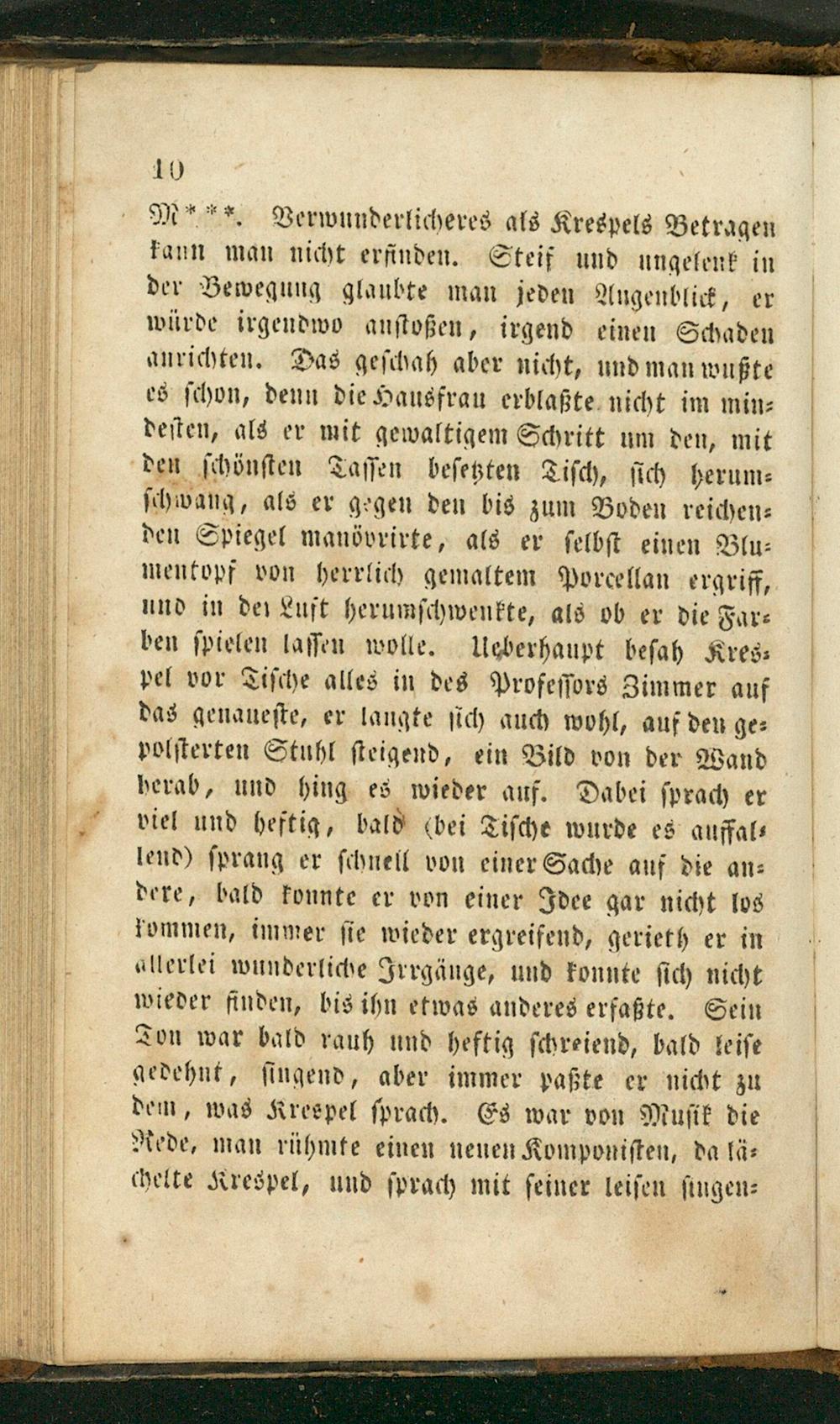 Mrns. Verwunderlicheres als Krespels Betragen kann man nicht erfinden. Steif und ungelenk in der Bewegung glaubte man jeden Augenblick, er würde irgendwo anſtoßen, irgend einen Schaden anrichten. Das geſchah aber nicht, und man wußte es ſchon, denn die Hausfrau erblaßte nicht im min⸗ deſten, als er mit gewaltigem Schritt um den, mit den ſchönſten Taſſen beſetzten Tiſch, ſich herum⸗ ſchwang, als er gegen den bis zum Boden reichen⸗ den Spiegel manövrirte, als er ſelbſt einen Blu⸗ mentopf von herrlich gemaltem Porcellan ergriff, und in der Luft herumſchwenkte, als ob er die Far⸗ ben ſpielen laſſen wolle. Ueberhaupt beſah Kres⸗ pel vor Tiſche alles in des Profeſſors Zimmer auf das genaueſte, er langte ſich auch wohl, auf den ge⸗ polſterten Stuhl ſteigend, ein Bild von der Wand berab, und hing es wieder auf. Dabei ſprach er viel und heftig, bald(bei Tiſche wurde es auffal⸗ lend) ſprang er ſchnell von einer Sache auf die an⸗ dere, bald konnte er von einer Idee gar nicht los kommen, immer ſie wieder ergreifend, gerieth er in allerlei wunderliche Irrgänge, und konnte ſich nicht wieder finden, bis ihn etwas anderes erfaßte. Sein Ton war bald rauh und heftig ſchreiend, bald leiſe gedehnt, ſingend, aber immer paßte er nicht zu dem, was Krespel ſprach. Es war von Muſik die Rede, man rühmte einen neuen Komponiſten, da lä⸗ chelte Krespel, und ſprach mit ſeiner leiſen ſingen⸗