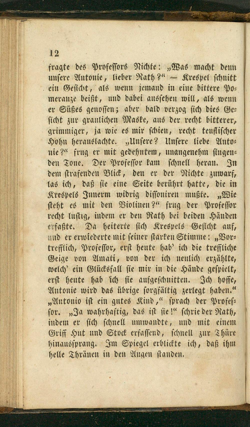fragte des Profeſſors Nichte:„Was macht denn unſere Antonie, lieber Rath?“=— Krespel ſchnitt ein Geſicht, als wenn jemand in eine bittere Po⸗ meranze beißt, und dabei ausſehen will, als wenn er Süßes genoſſen; aber bald verzog ſich dies Ge⸗ ſicht zur graulichen Maske, aus der recht bitterer, grimmiger, ja wie es mir ſchien, recht teufliſcher Hohn herauslachte.„Unſere? Unſere liebe Anto⸗ nie?“ frug er mit gedehntem, unangenehm ſingen⸗ den Tone. Der Profeſſor kam ſchnell heran. In dem ſtrafenden Blick, den er der Nichte zuwarf, las ich, daß ſie eine Seite berührt hatte, die in Krespels Innerm widrig diſſoniren mußte.„Wie ſteht es mit den Violinen?“ frug der Profeſſor recht luſtig, indem er den Rath bei beiden Händen erfaßte. Da heiterte ſich Krespels Geſicht auf, und er erwiederte mit ſeiner ſtarken Stimme:„Vor⸗ trefflich, Profeſſor, erſt heute hab' ich die treffliche Geige von Amati, von der ich neulich erzählte, welch' ein Glücksfall ſie mir in die Hände geſpielt, erſt heute hab ich ſie aufgeſchnitten. Ich hoffe, Antonie wird das übrige ſorgfältig zerlegt haben.“ „Antonio iſt ein gutes Kind,“ ſprach der Profeſ⸗ ſor.„Ja wahrhaftig, das iſt ſie!“ ſchrie der Rath, indem er ſich ſchnell umwandte, und mit einem Griff Hut und Stock erfaſſend, ſchnell zur Thüre hinausſprang. Im Spiegel erblickte ich, daß ihm helle Thränen in den Augen ſtanden.
