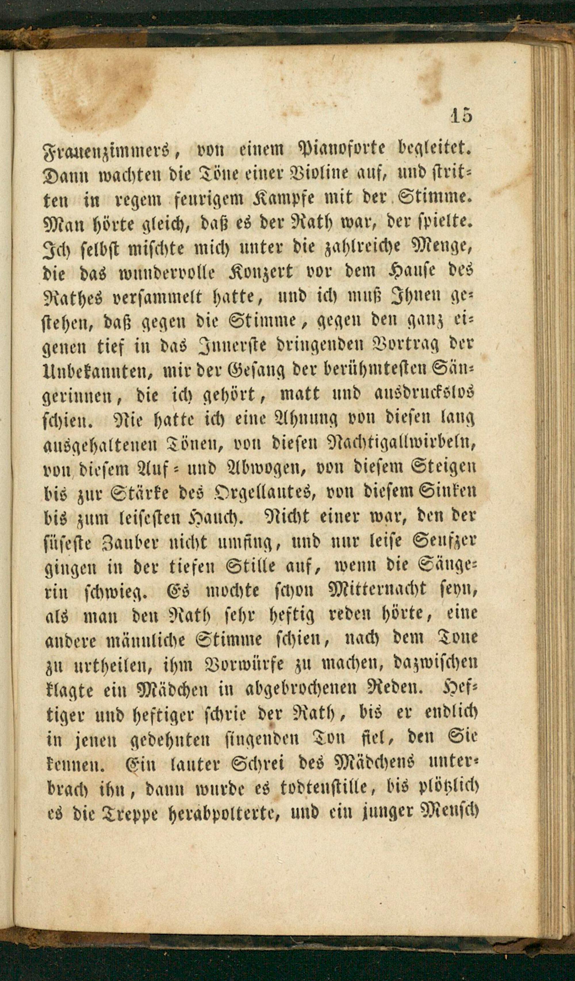 Frauenzimmers, von einem Pianoforte begleitet. Dann wachten die Töne einer Violine auf, und ſtrit⸗ ten in regem feurigem Kampfe mit der Stimme. Man hörte gleich, daß es der Rath war, der ſpielte. Ich ſelbſt miſchte mich unter die zahlreiche Menge, die das wundervolle Konzert vor dem Hauſe des Rathes verſammelt hatte, und ich muß Ihnen ge⸗ ſtehen, daß gegen die Stimme, gegen den ganz ei⸗ genen tief in das Innerſte dringenden Vortrag der Unbekannten, mir der Geſang der berühmteſten Sän⸗ gerinnen, die ich gehört, matt und ausdruckslos ſchien. Nie hatte ich eine Ahnung von dieſen lang ausgehaltenen Tönen, von dieſen Nachtigallwirbeln, von dieſem Auf⸗ und Abwogen, von dieſem Steigen bis zur Stärke des Orgellautes, von dieſem Sinken bis zum leiſeſten Hauch. Nicht einer war, den der ſüſeſte Zauber nicht umfing, und nur leiſe Seufzer gingen in der tiefen Stille auf, wenn die Sänge⸗ rin ſchwieg. Es mochte ſchon Mitternacht ſeyn, als man den Nath ſehr heftig reden hörte, eine andere männliche Stimme ſchien, nach dem Tone zu urtheilen, ihm Vorwürfe zu machen, dazwiſchen klagte ein Mädchen in abgebrochenen Reden. Hef⸗ tiger und heftiger ſchrie der Rath, bis er endlich in jenen gedehnten ſingenden Ton ſiel, den Sie kennen. Ein lauter Schrei des Mädchens unter⸗ brach ihn, dann wurde es todtenſtille, bis plötzlich es die Treppe herabpolterte, und ein junger Menſch