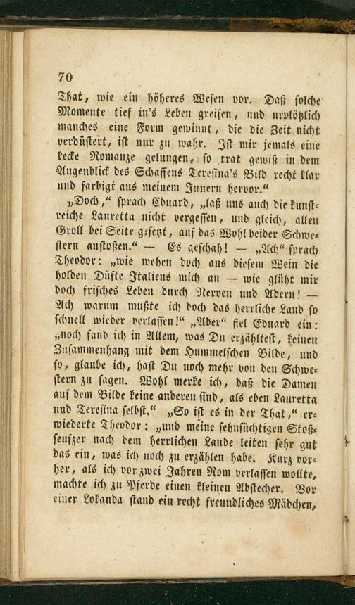 „»Doch,“ ſprach Eduard,„laß uns auch die kunſt⸗ reiche Lauretta nicht vergeſſen, und gleich, allen Groll bei Seite geſetzt, auf das Wohl beider Schwe⸗ ſtern anſtoßen.“— Es geſchah!—„Ach“ ſprach Theodor:„wie wehen doch aus dieſem Wein die holden Düfte Italiens mich an— wie glüht mir doch friſches Leben durch Nerven und Adern!— Ach warum mußte ich doch das herrliche Land ſo ſchnell wieder verlaſſen!“«„Aber“ fiel Eduard ein: „noch fand ich in Allem, was Du erzählteſt, keinen Zuſammenhang mit dem Hummelſchen Bilde, und ſo, glaube ich, haſt Du noch mehr von den Schwe⸗ ſtern zu ſagen. Wohl merke ich, daß die Damen auf dem Bilde keine anderen ſind, als eben Lauretta und Tereſina ſelbſt.“„So iſt es in der That,“ er⸗ wiederte Theodor:„und meine ſehnſüchtigen Stoß⸗ ſeufzer nach dem herrlichen Lande leiten ſehr gut das ein, was ich noch zu erzählen habe. Kurz vor⸗ her, als ich vor zwei Jahren Rom verlaſſen wollte, machte ich zu Pferde einen kleinen Abſtecher. Vor einer Lokanda ſtand ein recht freundliches Mädchen,