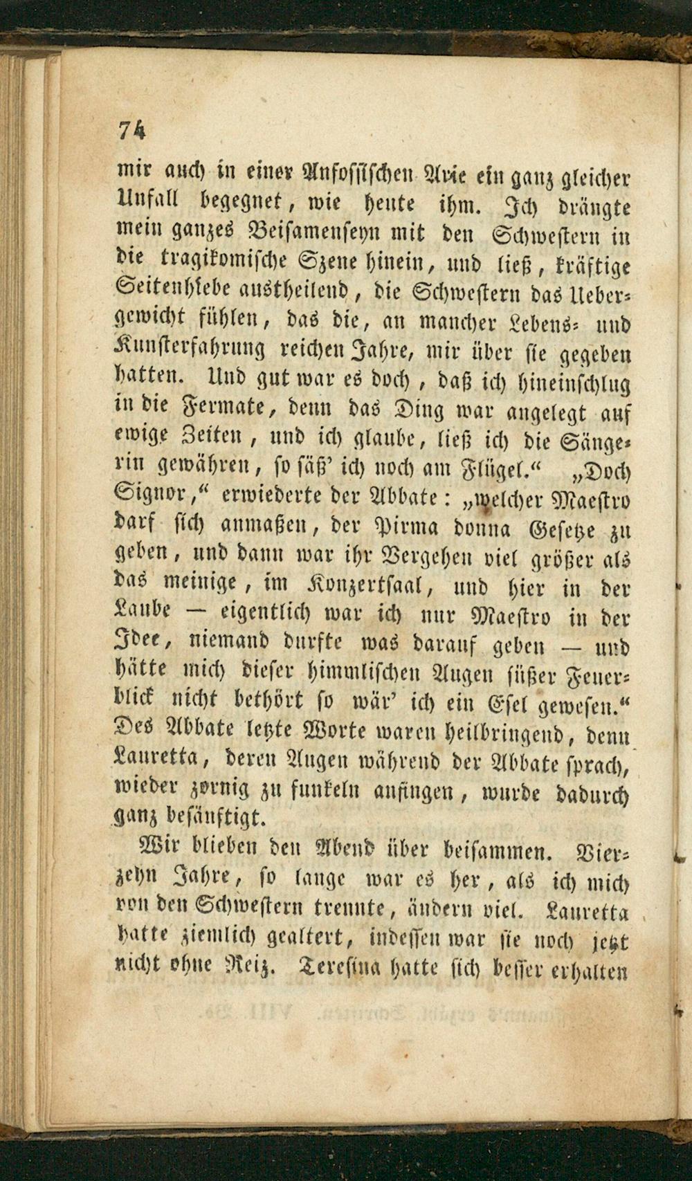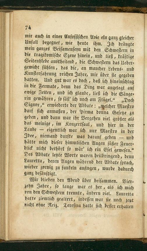mir auch in einer Anfoſſiſchen Arie ein ganz gleicher Unfall begegnet, wie heute ihm. Ich drängte mein ganzes Beiſamenſeyn mit den Schweſtern in die tragikomiſche Szene hinein, und ließ, kräftige Seitenhiebe austheilend, die Schweſtern das Ueber⸗ gewicht fühlen, das die, an mancher Lebens⸗ und Kunſterfahrung reichen Jahre, mir über ſie gegeben hatten. Und gut war es doch, daß ich hineinſchlug in die Fermate, denn das Ding war angelegt auf ewige Zeiten, und ich glaube, ließ ich die Sänge⸗ rin gewähren, ſo ſäß' ich noch am Flügel.“„Doch Signor,“ erwiederte der Abbate:„welcher Maeſtro darf ſich anmaßen, der Pirma donna Geſetze zu geben, und dann war ihr Vergehen viel größer als das meinige, im Konzertſaal, und hier in der Laube— eigentlich war ich nur Maeſtro in der Idee, niemand durfte was darauf geben— und hätte mich dieſer himmliſchen Augen ſüßer Feuer⸗ blick nicht bethört ſo wär' ich ein Eſel geweſen.“ Des Abbate letzte Worte waren heilbringend, denn Lauretta, deren Augen während der Abbate ſprach, wieder zornig zu funkeln anfingen, wurde dadurch ganz beſänuftigt.