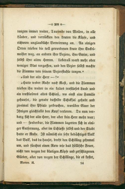 „Hatte weder Ruhe noch Raſt, und die Flammen trieben ihn weiter in ein kaltes troſtloſes Land und ein troſtloſeres altes Schloß, wo einſt eine Familie gehauſet, die gerade daſſelbe Schickſal gehabt und zweimal ihre Phiole zerbrochen, worüber Einer der Ihrigen gleichfalls den Kopf verloren. Da nun ver⸗ barg ſich der alte Herr, der aber kein Herr mehr war; und— ſonderbar, die Flammen lagerten ſich in eini⸗ ger Entfernung, aber im Schloſſe ſelbſt und der Stadt hatte er Ruhe. Iſt nämlich ein ſehr bedächtiges Volk das Volk, das da hauſet, dreht den Schilling zehnmal um, und fürchtet einen Row wie das hölliſche Feuer, nicht von wegen der blutigen Köpfe und zerſchlagenen Glieder, aber von wegen der Schillinge, die es koſtet,