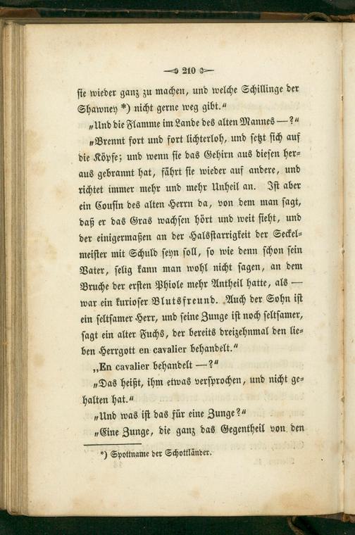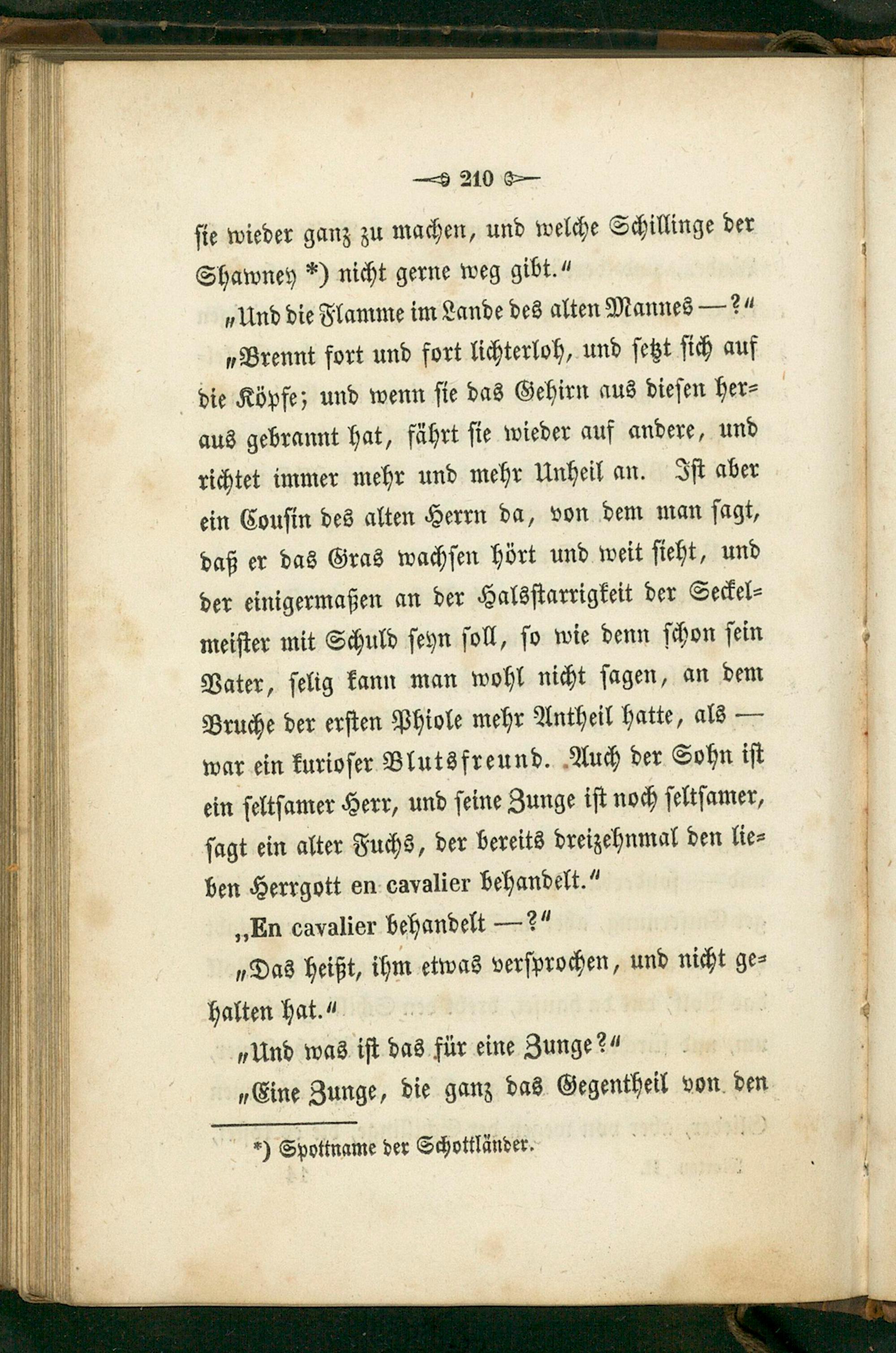 „Brennt fort und fort lichterloh, und ſetzt ſich auf die Köpfe; und wenn ſie das Gehirn aus dieſen her⸗ aus gebrannt hat, fährt ſie wieder auf andere, und richtet immer mehr und mehr Unheil an. Iſt aber ein Couſin des alten Herrn da, von dem man ſagt, daß er das Gras wachſen hört und weit ſieht, und der einigermaßen an der Halsſtarrigkeit der Seckel⸗ meiſter mit Schuld ſeyn ſoll, ſo wie denn ſchon ſein Vater, ſelig kann man wohl nicht ſagen, an dem Bruche der erſten Phiole mehr Antheil hatte, als— war ein kurioſer Blutsfreund. Auch der Sohn iſt ein ſeltſamer Herr, und ſeine Zunge iſt noch ſeltſamer, ſagt ein alter Fuchs, der bereits dreizehnmal den lie⸗ ben Herrgott en cavalier behandelt.“