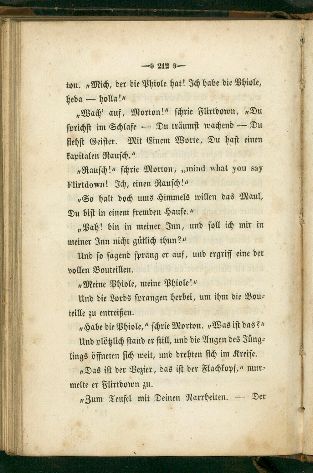 „Wach' auf, Morton!“ ſchrie Flirtdown,„Du ſprichſt im Schlafe— Du träumſt wachend— Du ſiehſt Geiſter. Mit Einem Worte, Du haſt einen kapitalen Rauſch.“