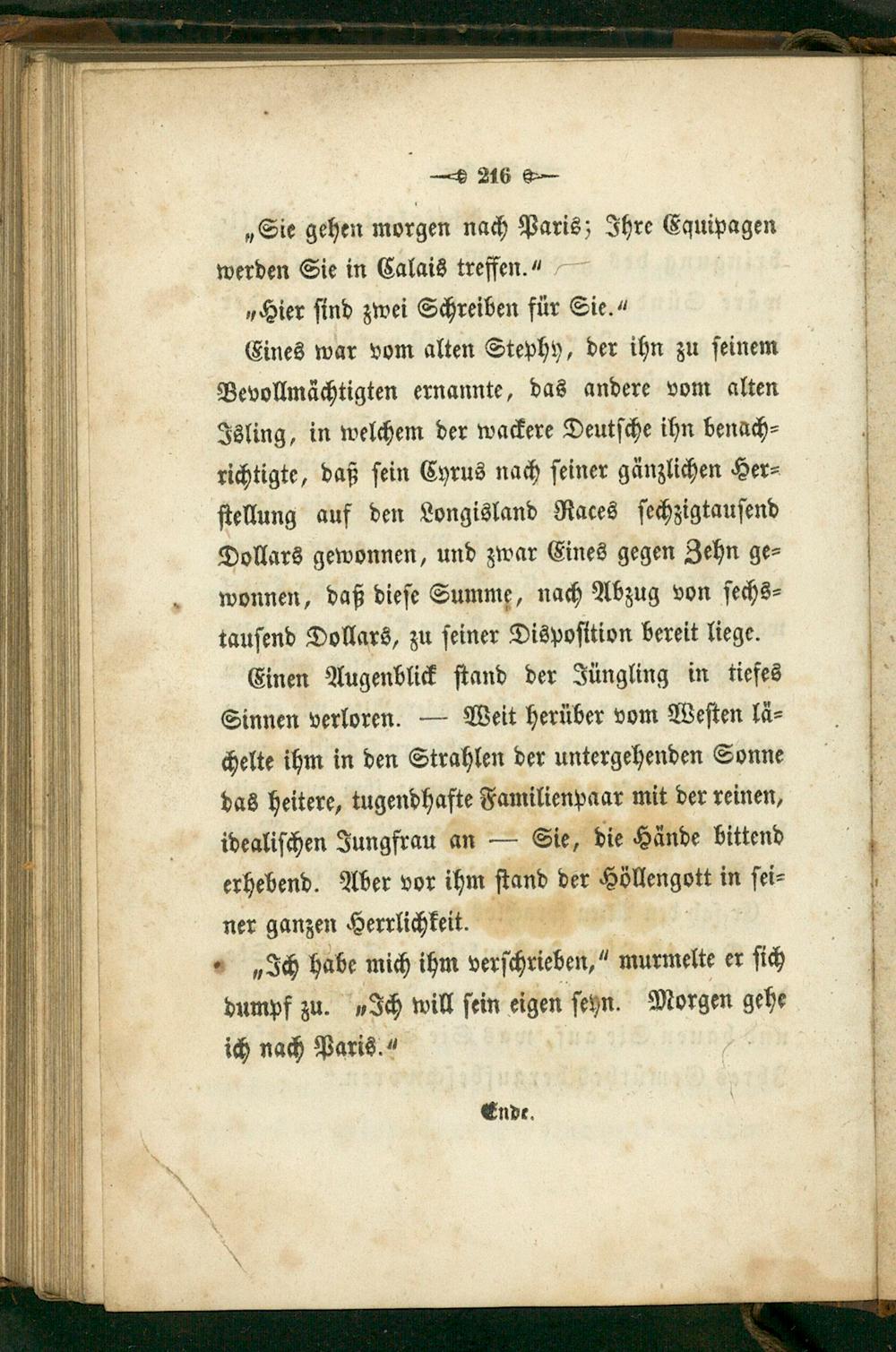 Eines war vom alten Stephy, der ihn zu ſeinem Bevollmächtigten ernannte, das andere vom alten Isling, in welchem der wackere Deutſche ihn benach⸗ richtigte, daß ſein Cyrus nach ſeiner gänzlichen Her⸗ ſtellung auf den Longisland Races ſechzigtauſend Dollars gewonnen, und zwar Eines gegen Zehn ge⸗ wonnen, daß dieſe Summe, nach Abzug von ſechs⸗ tauſend Dollars, zu ſeiner Dispoſttion bereit liege.