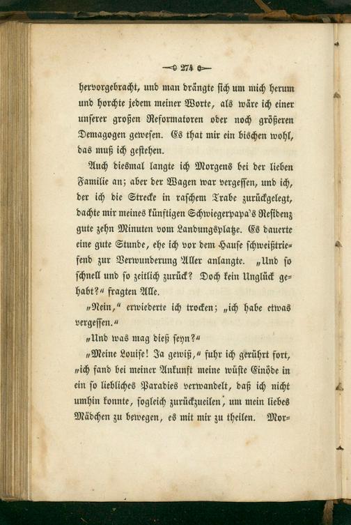Auch diesmal langte ich Morgens bei der lieben Familie an; aber der Wagen war vergeſſen, und ich, der ich die Strecke in raſchem Trabe zurückgelegt, dachte mir meines künftigen Schwiegerpapa's Reſidenz gute zehn Minuten vom Landungsplatze. Es dauerte eine gute Stunde, ehe ich vor dem Hauſe ſchweißtrie⸗ fend zur Verwunderung Aller anlangte.„Und ſo ſchnell und ſo zeitlich zurück? Doch kein Unglück ge⸗ habt?“ fragten Alle.