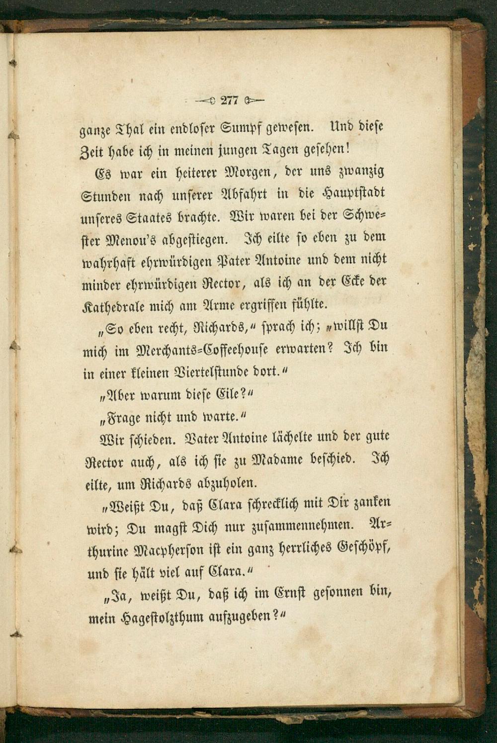Es war ein heiterer Morgen, der uns zwanzig Stunden nach unſerer Abfahrt in die Hauptſtadt unſeres Staates brachte. Wir waren bei der Schwe⸗ ſter Menou's abgeſtiegen. Ich eilte ſo eben zu dem wahrhaft ehrwürdigen Pater Antoine und dem nicht minder ehrwürdigen Rector, als ich an der Ecke der Kathedrale mich am Arme ergriffen fühlte.