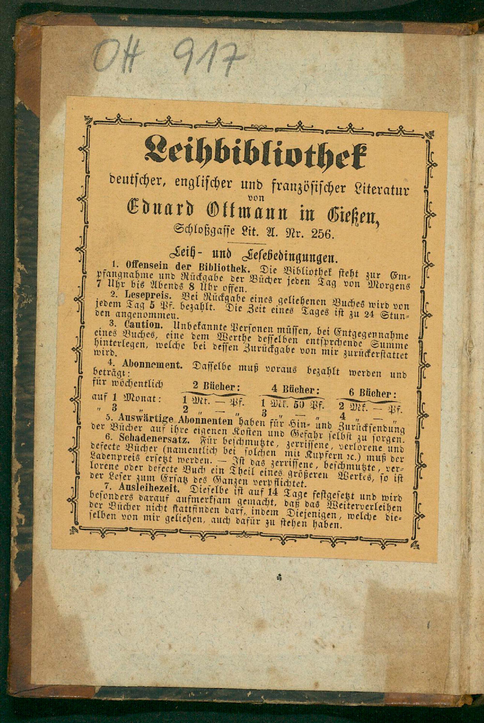 „ 4 5. Auswärtige Abonnenten haben für Kin. und Aariſendung Bücher auf ihre eigenen Ko fahr ſelbſt zu ſorgen. 6. Schadenersatz. Für beſe„zerriſſene, verlorene und defecte Bücher(namentli⸗ mir Kupfern ꝛc.) muß der Ladenpreis e erſe. S 4 riſſene, beſchmutzte, ver⸗ größeren Werkes, ſo iſt jun zen belrr nins hen 8 Jes ſelbe iſt auf 14 Tage feſtgeſetzt und wird befunra darauf ufcnerelin gemacht, daß das Weiterverleihen der Bücher nicht ſtattfinden darf, indem hiejen gen⸗ welche die⸗ ſelben von mir geliehen, auch dafür zu ſtehen haben