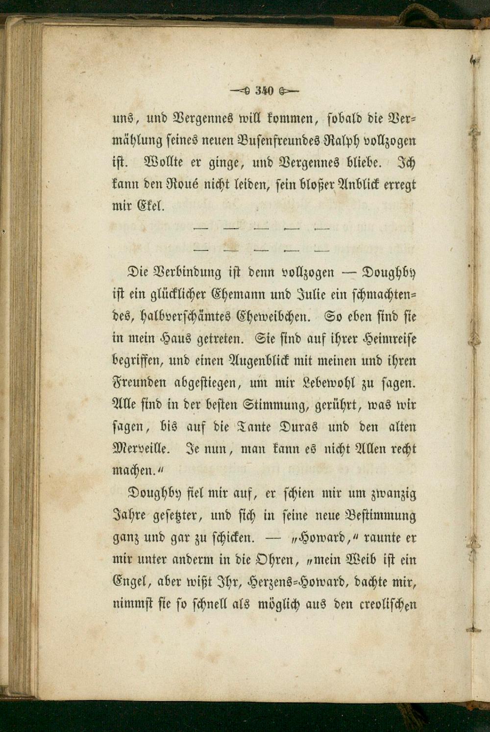 Die Verbindung iſt denn vollzogen— Doughby iſt ein glücklicher Ehemann und Julie ein ſchmachten⸗ des, halbverſchämtes Eheweibchen. So eben ſind ſie in mein Haus getreten. Sie ſind auf ihrer Heimreiſe 3 begriffen, und einen Augenblick mit meinen und ihren Freunden abgeſtiegen, um mir Lebewohl zu ſagen. Alle ſind in der beſten Stimmung, gerührt, was wir ſagen, bis auf die Tante Duras und den alten Merveille. Je nun, man kann es nicht Allen recht machen.“