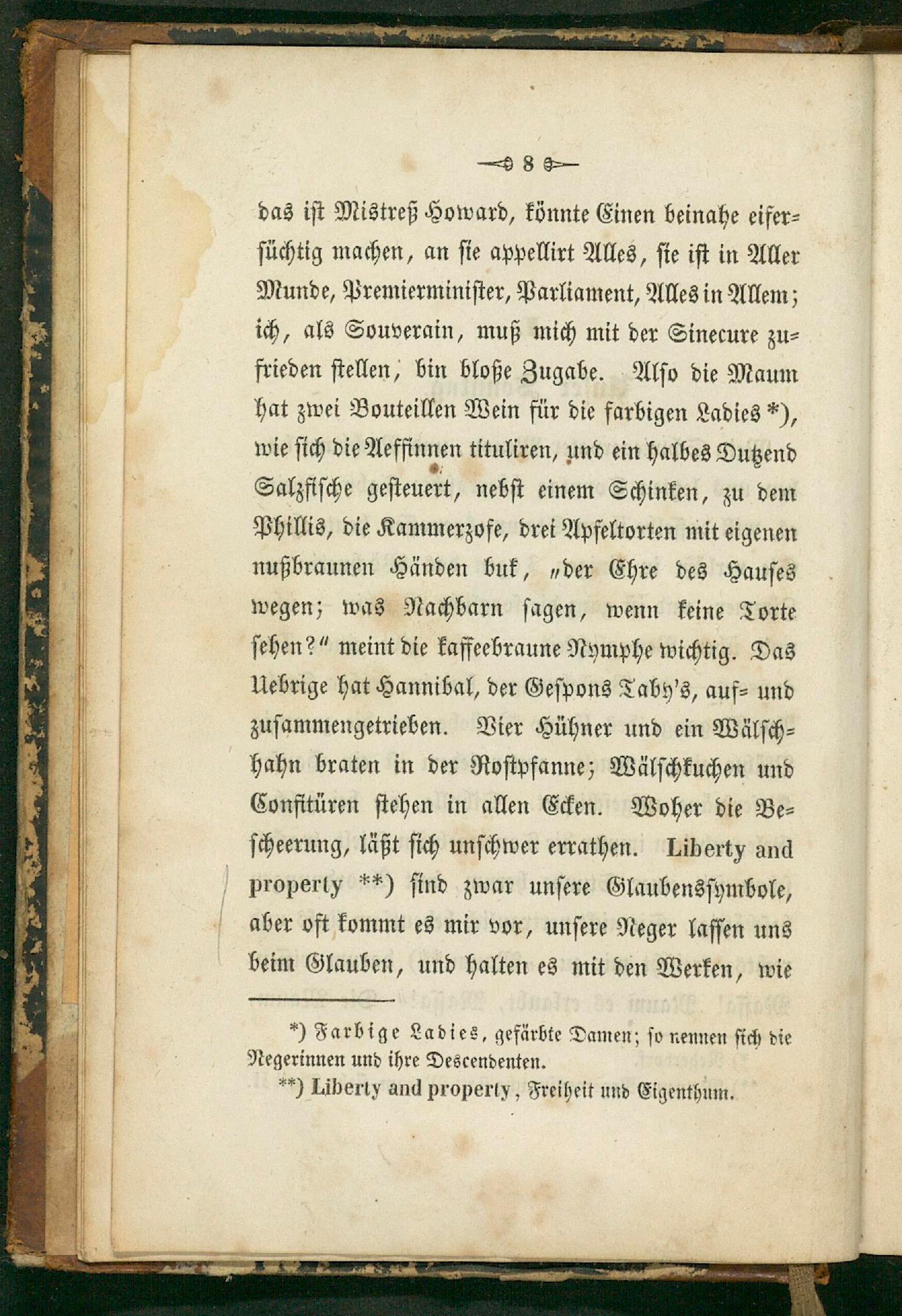 das iſt Mistreß Howard, könnte Einen beinahe eifer⸗ ſüchtig machen, an ſte appellirt Alles, ſte iſt in Aller Munde, Premierminiſter, Parliament, Alles in Allem; ich, als Souverain, muß mich mit der Sinecure zu⸗ frieden ſtellen, bin bloße Zugabe. Alſo die Maum hat zwei Bouteillen Wein für die farbigen Ladies*), wie ſich die Aeffinnen tituliren, und ein halbes Dutzend Salzfiſche geſteuert, nebſt einem Schinken, zu dem Phillis, die Kammerzofe, drei Apfeltorten mit eigenen nußbraunen Händen buk,„der Ehre des Hauſes wegen; was Nachbarn ſagen, wenn keine Torte ſehen?“ meint die kaffeebraune Nymphe wichtig. Das Uebrige hat Hannibal, der Geſpons Taby's, auf⸗ und zuſammengetrieben. Vier Hühner und ein Wälſch⸗ hahn braten in der Roſtpfanne; Wälſchkuchen und Confitüren ſtehen in allen Ecken. Woher die Be⸗ ſcheerung, läßt ſich unſchwer errathen. Liberty and property**) ſind zwar unſere Glaubensſymbole, aber oft kommt es mir vor, unſere Neger laſſen uns beim Glauben, und halten es mit den Werken, wie