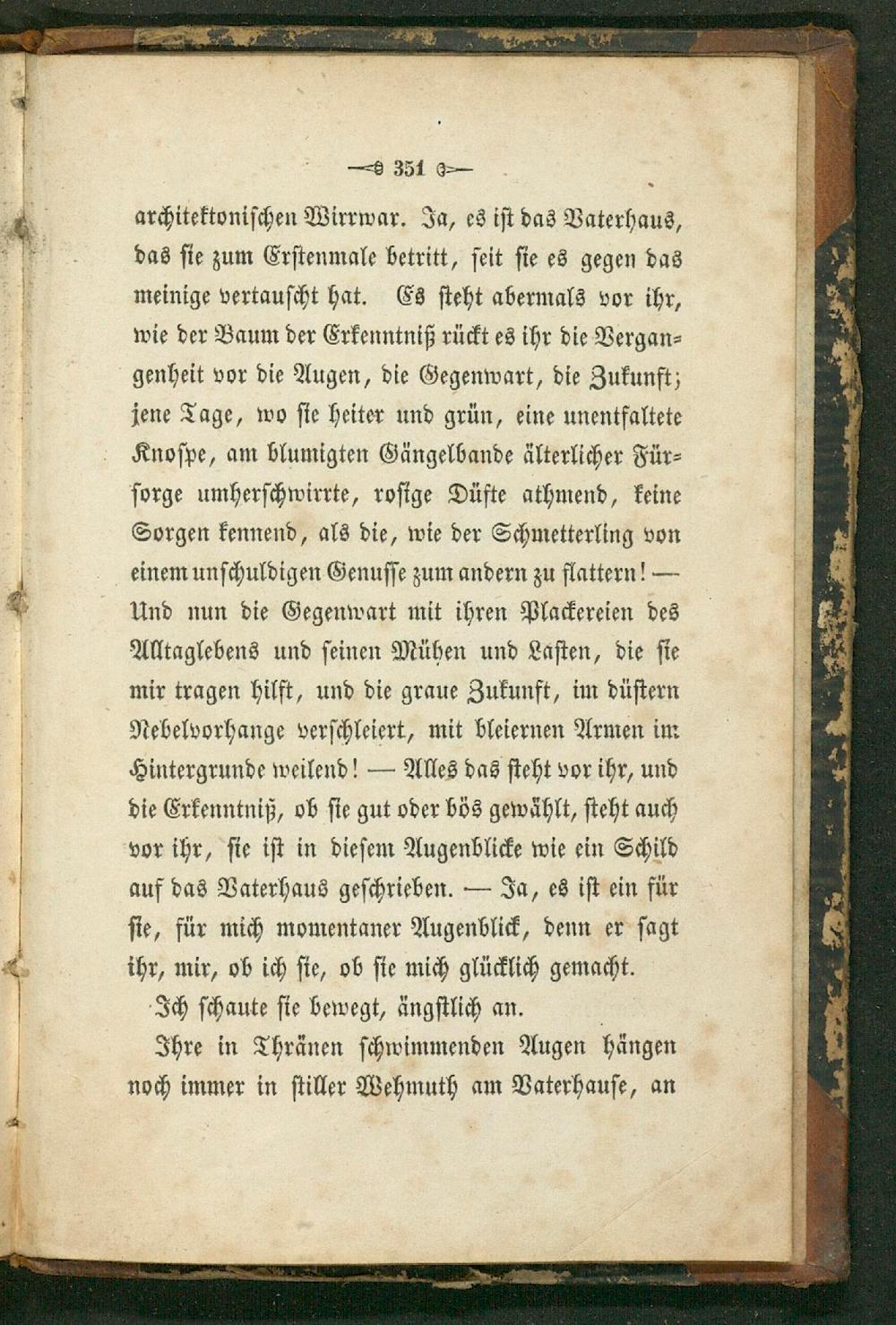 architektoniſchen Wirrwar. Ja, es iſt das Vaterhaus, das ſie zum Erſtenmale betritt, ſeit ſte es gegen das meinige vertauſcht hat. Es ſteht abermals vor ihr, wie der Baum der Erkenntniß rückt es ihr die Vergan⸗ genheit vor die Augen, die Gegenwart, die Zukunft; jene Tage, wo ſte heiter und grün, eine unentfaltete Knoſpe, am blumigten Gängelbande älterlicher Für⸗ ſorge umherſchwirrte, roſige Düfte athmend, keine Sorgen kennend, als die, wie der Schmetterling von einem unſchuldigen Genuſſe zum andern zu flattern!— Und nun die Gegenwart mit ihren Plackereien des Alltaglebens und ſeinen Mühen und Laſten, die ſie mir tragen hilft, und die graue Zukunft, im düſtern Nebelvorhange verſchleiert, mit bleiernen Armen im Hintergrunde weilend!— Alles das ſteht vor ihr, und die Erkenntniß, ob ſte gut oder bös gewählt, ſteht auch vor ihr, ſie iſt in dieſem Augenblicke wie ein Schild auf das Vaterhaus geſchrieben.— Ja, es iſt ein für ſie, für mich momentaner Augenblick, denn er ſagt ihr, mir, ob ich ſie, ob ſie mich glücklich gemacht.