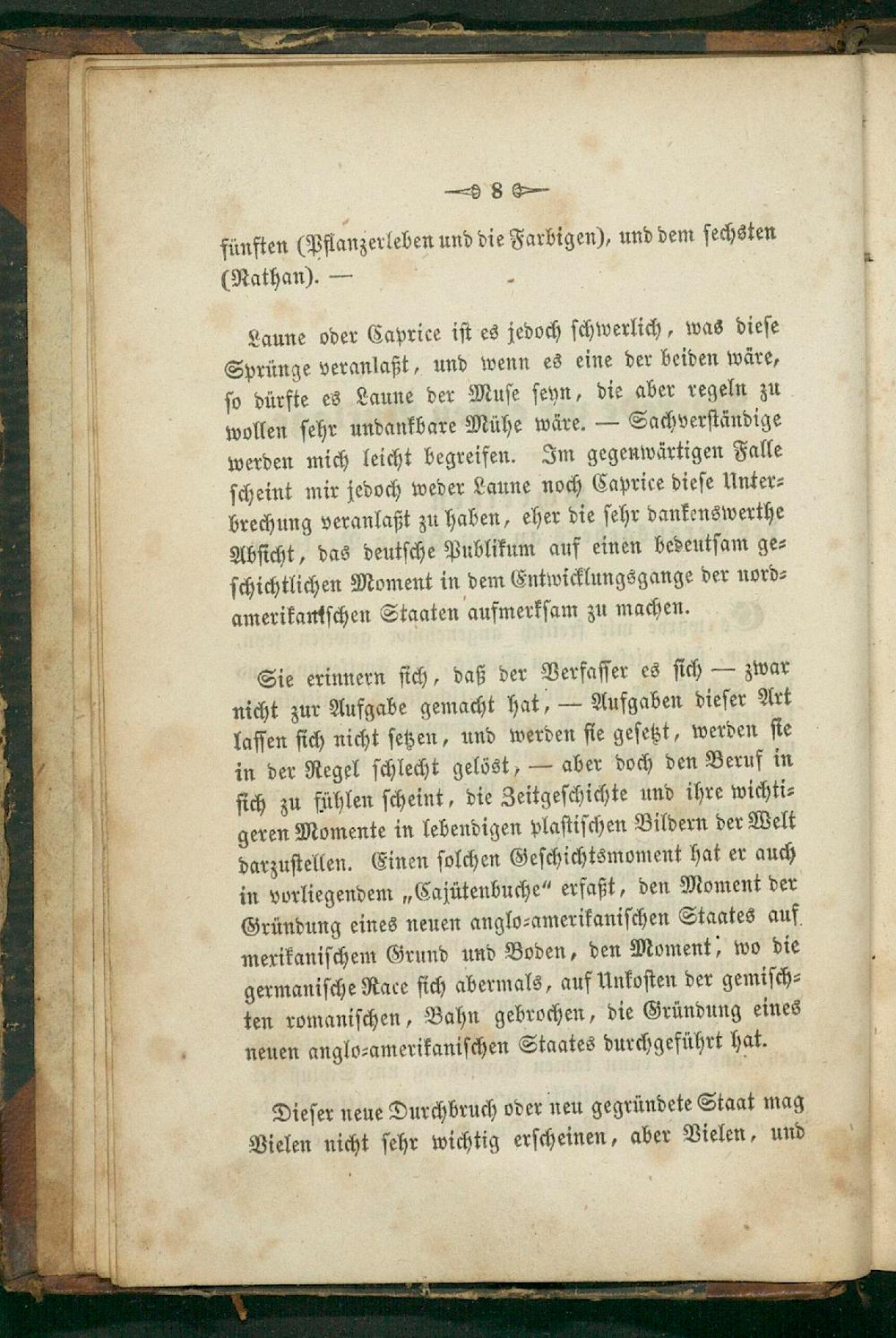 fünſten(Pflanzerleben und die Farbigen), und dem ſechsten (Nathan).—„ Laune oder Capriee iſt es jedoch ſchwerlich, was dieſe Sprünge veranlaßt, und wenn es eine der beiden wäre, ſo dürfte es Laune der Muſe ſeyn, die aber regeln zu wollen ſehr undankbare Mühe wäre.— Sachverſtändige werden mich leicht begreifen. Im gegenwärtigen Falle ſcheint mir jedoch weder Laune noch Caprice dieſe Unter⸗ brechung veranlaßt zu haben, eher die ſehr dankenswerthe Abſicht, das deutſche Publikum auf einen bedeutſam ge⸗ ſchichtlichen Moment in dem Entwicklungsgange der nord⸗ amerikaniſchen Staaten aufmerkſam zu machen.