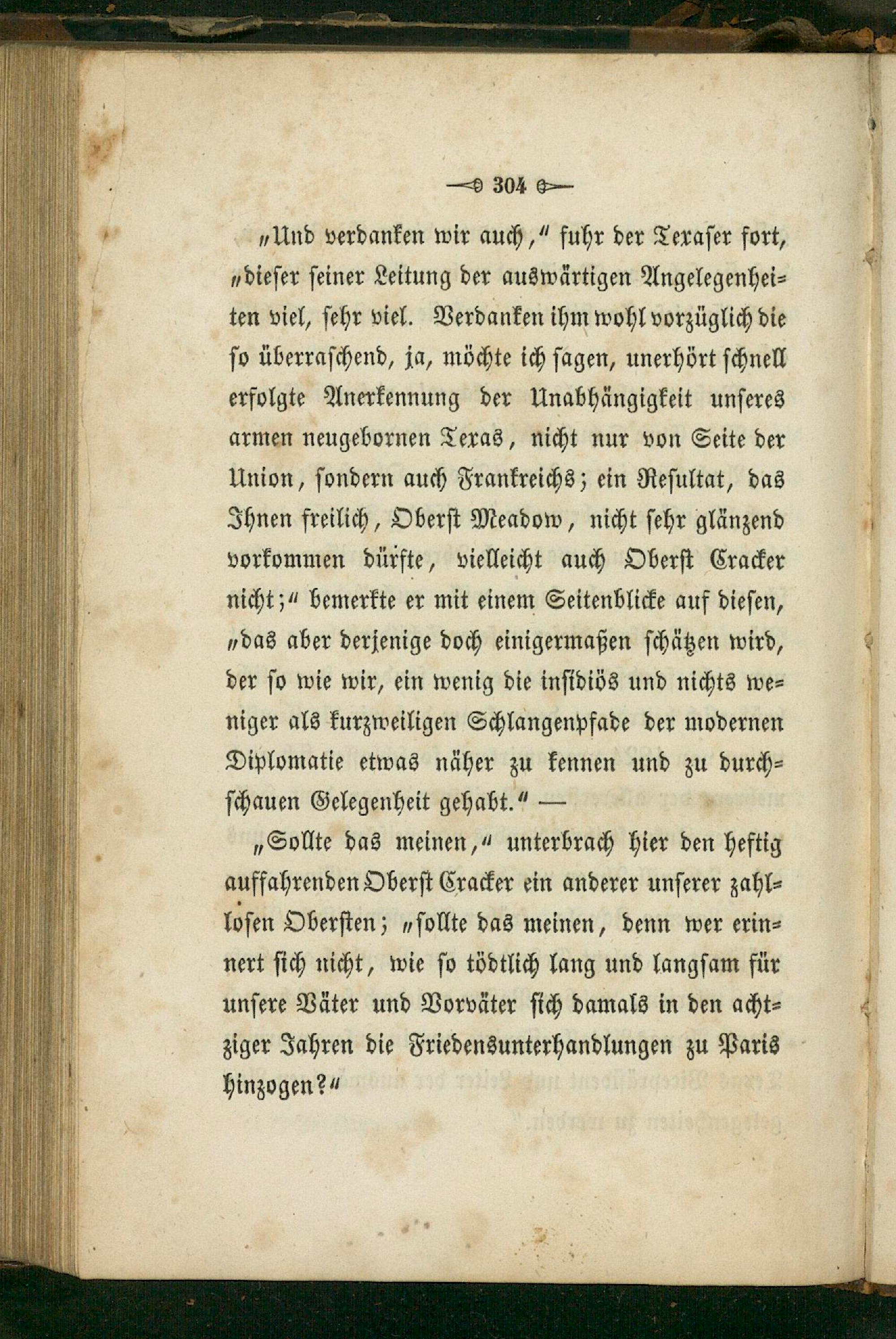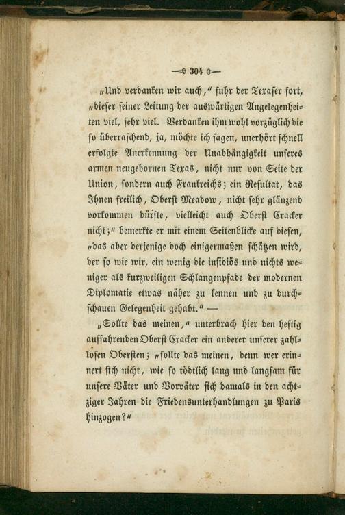 „Und verdanken wir auch,“ fuhr der Texaſer fort, „dieſer ſeiner Leitung der auswärtigen Angelegenhei⸗ ten viel, ſehr viel. Verdanken ihm wohl vorzüglich die ſo überraſchend, ja, möchte ich ſagen, unerhört ſchnell erfolgte Anerkennung der Unabhängigkeit unſeres armen neugebornen Texas, nicht nur von Seite der Union, ſondern auch Frankreichs; ein Reſultat, das 4 Ihnen freilich, Oberſt Meadow, nicht ſehr glänzend 1 vorkommen dürfte, vielleicht auch Oberſt Cracker