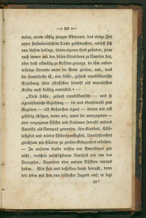 „Dieſe frühe, geſund republikaniſche— uns ſo eigenthümliche Erziehung— die uns ebenſowohl zum Regieren— als Gehorchen eignet— lernen wir erſt gehörig ſchätzen, wenn wir, unter die unerzogenen— oder verzogenen Völker und Nationen ſowohl unſeres Amerika als Europas geworfen, ihre Kindheit, Hülf⸗ loſigkeit und wieder Widerſpenſtigkeit, Unerfahrenheit gleichſam mit Händen zu greifen Gelegenheit erhalten. — In unſerem Lande wiſſen wir Amerikaner gar nicht, welchen unſchätzbaren Vortheil wir vor den Franzoſen, Spaniern oder andern Völkern voraus haben. Wir ſind uns deſſelben kaum bewußt, denn wir leben mit ihm von früheſter Jugend auf; er legt