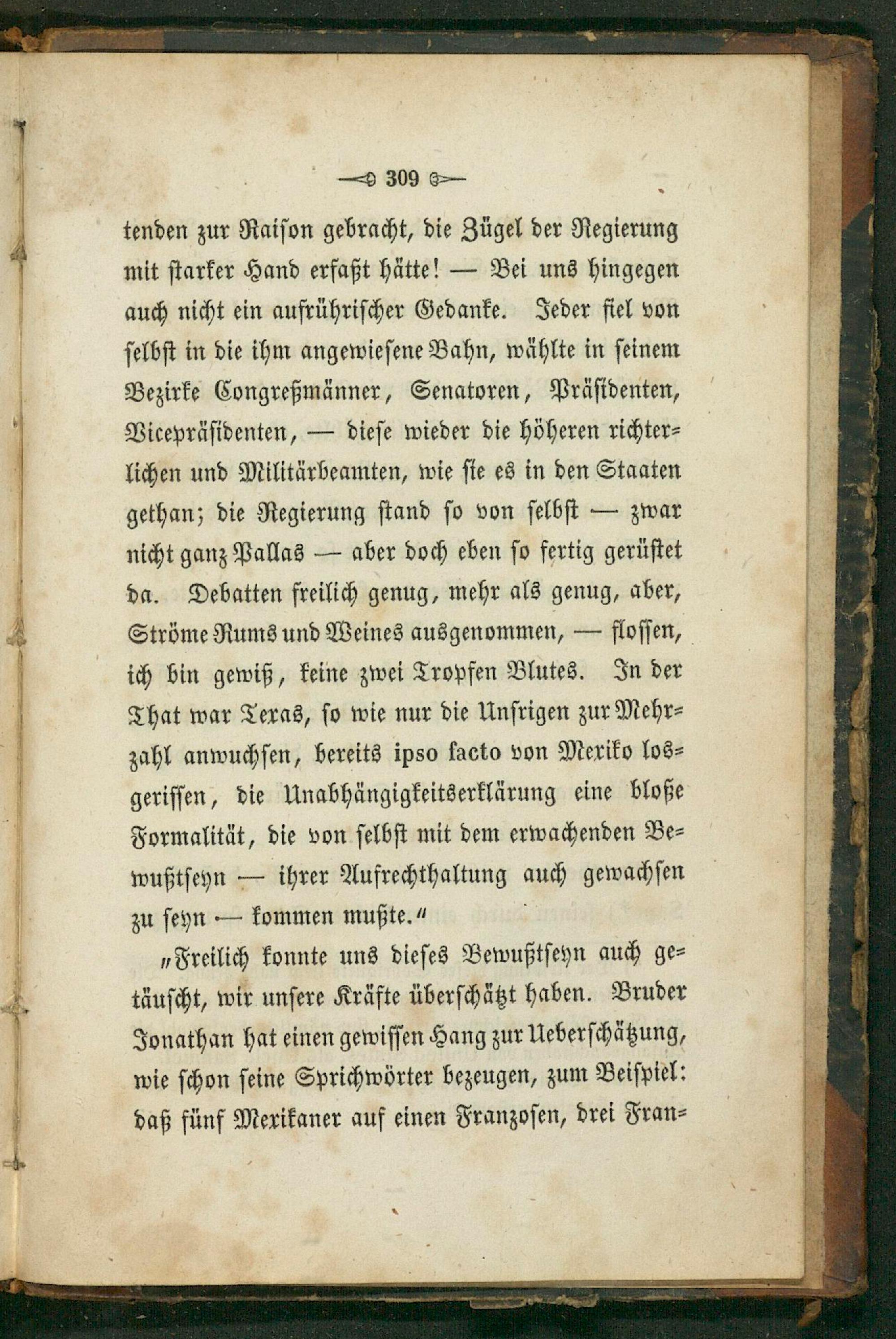 tenden zur Raiſon gebracht, die Zügel der Regierung mit ſtarker Hand erfaßt hätte!— Bei uns hingegen auch nicht ein aufrühriſcher Gedanke. Jeder fiel von ſelbſt in die ihm angewieſene Bahn, wählte in ſeinem Bezirke Congreßmänner, Senatoren, Präſidenten, Vicepräſidenten,— dieſe wieder die höheren richter⸗ lichen und Militärbeamten, wie ſte es in den Staaten gethan; die Regierung ſtand ſo von ſelbſt— zwar nicht ganz Pallas— aber doch eben ſo fertig gerüſtet da. Debatten freilich genug, mehr als genug, aber, Ströme Rums und Weines ausgenommen,— floſſen, ich bin gewiß, keine zwei Tropfen Blutes. In der That war Texas, ſo wie nur die Unſrigen zur Mehr⸗ zahl anwuchſen, bereits ipso facto von Mexiko los⸗ geriſſen, die Unabhängigkeitserklärung eine bloße Formalität, die von ſelbſt mit dem erwachenden Be⸗ wußtſeyn— ihrer Aufrechthaltung auch gewachſen zu ſeyn— kommen mußte.“ 3