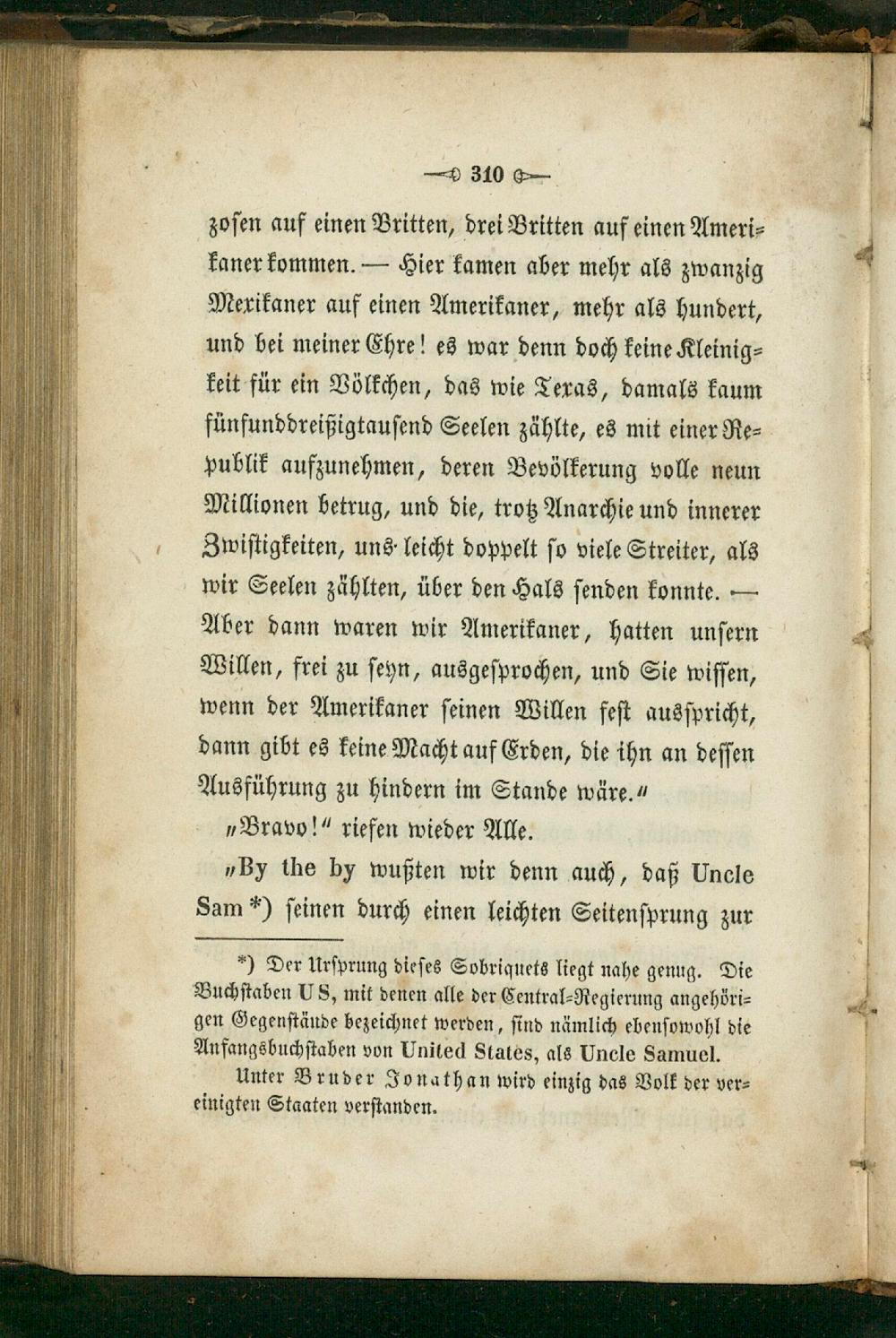 „By the by wußten wir denn auch, daß Uncle Sam*) ſeinen durch einen leichten Seitenſprung zur — Der Urſprung dieſes Sobriquets liegt nahe genug. Die Buchſtaben US, mit denen alle der Central⸗Regierung angehöri⸗ gen Gegenſtände bezeichnet werden, ſind nämlich ebenſowohl die Anfangsbuchſtaben von United States, als Uncle Samuel.