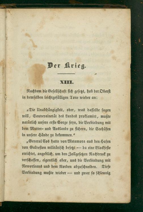 „General Cos hatte von Metamora aus den Hafen von Galveſton militäriſch beſetzt— da eine Blockfeſte errichtet, angeblich, um den Zollgeſetzen Nachdruck zu verſchaffen, eigentlich aber, uns die Verbindung mit Neworleans und dem Norden abzuſchneiden. Dieſe Verbindung mußte wieder— und zwar ſo ſchleunig