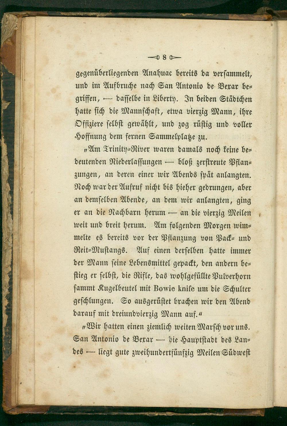 „Am Trinity⸗River waren damals noch keine be⸗ deutenden Niederlaſſungen— bloß zerſtreute Pflan⸗ zungen, an deren einer wir Abends ſpät anlangten. Noch war der Aufruf nicht bis hieher gedrungen, aber an demſelben Abende, an dem wir anlangten, ging er an die Nachbarn herum— an die vierzig Meilen weit und breit herum. Am folgenden Morgen wim⸗ melte es bereits vor der Pflanzung von Pack⸗ und Reit⸗Muſtangs. Auf einen derſelben hatte immer der Mann ſeine Lebensmittel gepackt, den andern be⸗ ſtieg er ſelbſt, die Rifle, das wohlgefüllte Pulverhorn ſammt Kugelbeutel mit Bowie knife um die Schulter geſchlungen. So ausgerüſtet brachen wir den Abend darauf mit dreiundvierzig Mann auf.“