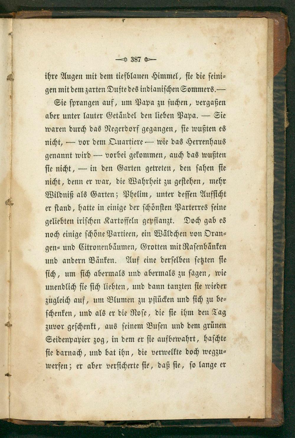 Sie ſprangen auf, um Papa zu ſuchen, vergaßen aber unter lauter Getändel den lieben Papa.— Sie waren durch das Negerdorf gegangen, ſte wußten es nicht,— vor dem Quartiere— wie das Herrenhaus genannt wird— vorbei gekommen, auch das wußten ſie nicht,— in den Garten getreten, den ſahen ſie nicht, denn er war, die Wahrheit zu geſtehen, mehr Wildniß als Garten; Phelim, unter deſſen Aufſicht er ſtand, hatte in einige der ſchönſten Parterres ſeine geliebten iriſchen Kartoffeln gepflanzt. Doch gab es noch einige ſchöne Partieen, ein Wäldchen von Oran⸗ gen⸗ und Citronenbäumen, Grotten mit Raſenbänken und andern Bänken. Auf eine derſelben ſetzten ſie ſich, um ſich abermals und abermals zu ſagen, wie unendlich ſie ſich liebten, und dann tanzten ſte wieder zugleich auf, um Blumen zu pflücken und ſich zu be⸗ ſchenken, und als er die Roſe, die ſie ihm den Tag zuvor geſchenkt, aus ſeinem Buſen und dem grünen Seidenpapier zog, in dem er ſie aufbewahrt, haſchte ſie darnach, und bat ihn, die verwelkte doch wegzu⸗ werfen; er aber verſicherte ſte, daß ſie, ſo lange er