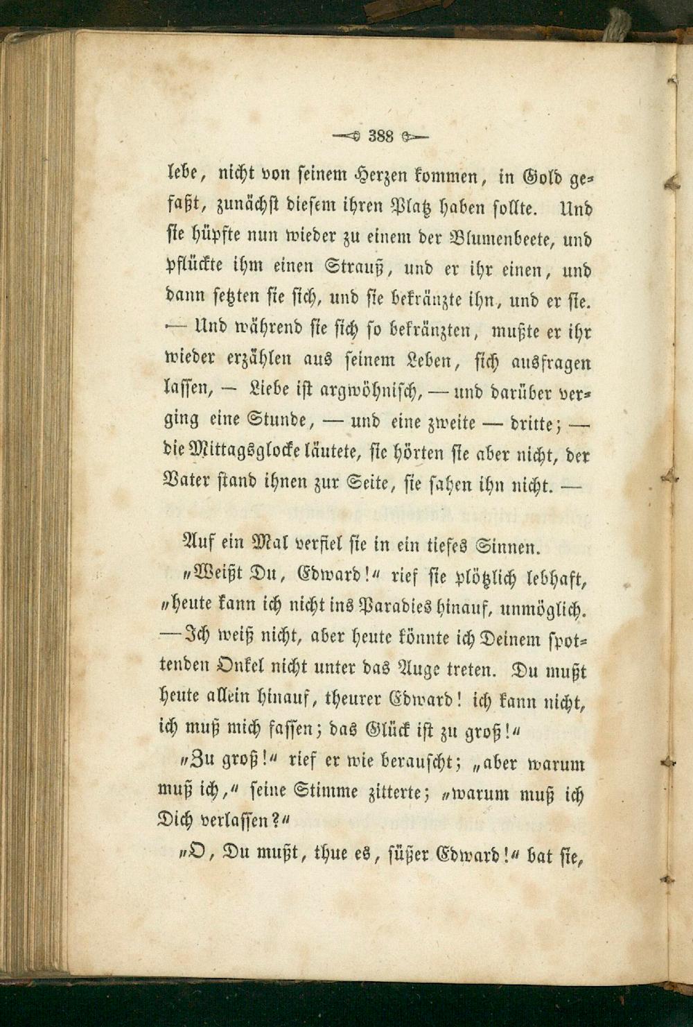 „Weißt Du, Edward!“ rief ſie plötzlich lebhaft, „heute kann ich nicht ins Paradies hinauf, unmöglich. — Ich weiß nicht, aber heute könnte ich Deinem ſpot⸗ tenden Onkel nicht unter das Auge treten. Du mußt heute allein hinauf, theurer Edward! ich kann nicht, ich muß mich faſſen; das Glück iſt zu groß!“
