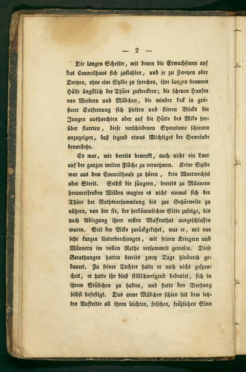 Ddie langen Schritte, mit denen die Erwachſenen auf das Councilhaus ſich zuſtahlen, und je zu Zweyen oder Dreyen, ohne eine Sylbe zu ſprechen, ihre langen braunen Hälſe ängſtlich der Thüre zuſtreckten; die ſcheuen Haufen von Weibern und Mädchen, die minder keck in grö⸗ ßerer Entfernung ſich hielten und ſtieren Blicks die Jungen aushorchten oder auf die Hütte des Miko her⸗ über ſtarrten, dieſe verſchiedenen Symptome ſchienen anzuzeigen, daß irgend etwas Wichtiges der Gemeinde bevorſtehe.