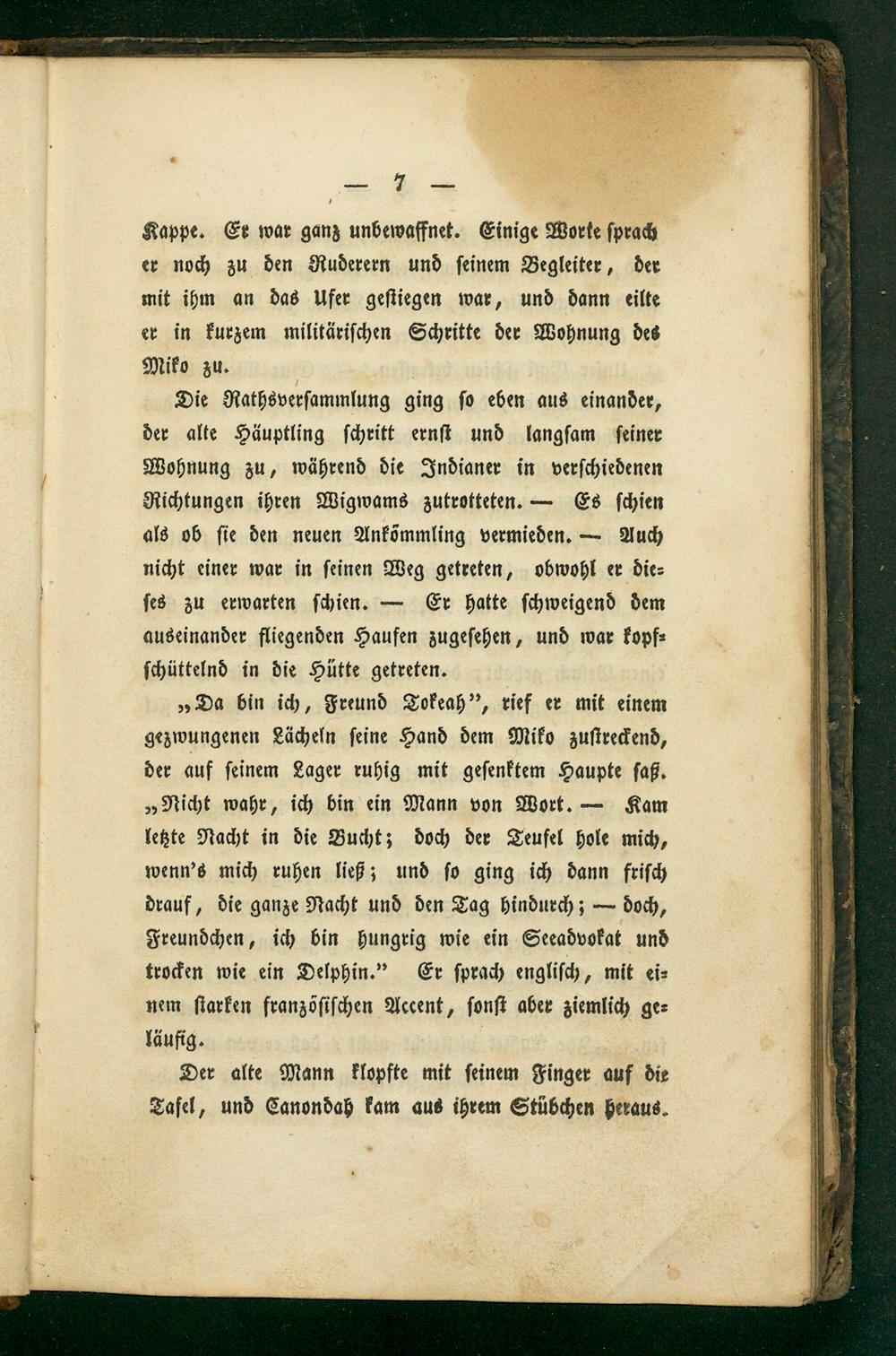 „Da bin ich, Freund Tokeah“, rief er mit einem gezwungenen Lächeln ſeine Hand dem Miko zuſtreckend, der auf ſeinem Lager ruhig mit geſenktem Haupte ſaß. „Nicht wahr, ich bin ein Mann von Wort.— Kam letzte Nacht in die Bucht; doch der Teufel hole mich, wenn's mich ruhen ließ; und ſo ging ich dann friſch drauf, die ganze Nacht und den Tag hindurch;— doch, Freunoͤchen, ich bin hungrig wie ein Seeadvokat und trocken wie ein Delphin.“ Er ſprach engliſch, mit ei⸗ nem ſtarken franzöſiſchen Accent, ſonſt aber ziemlich ge⸗ läufig.