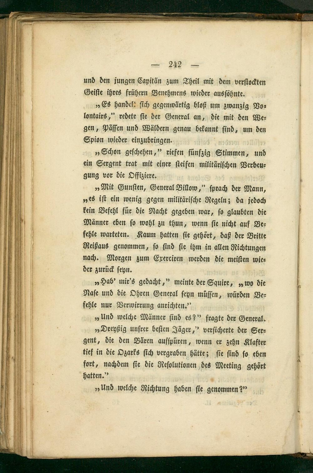 „Mit Gunſten, General Billow,“ ſprach der Mann, „es iſt ein wenig gegen militäriſche Regeln; da jedoch kein Befehl für die Nacht gegeben war, ſo glaubten die Männer eben ſo wohl zu thun, wenn ſie nicht auf Be⸗ fehle warteten. Kaum hatten ſie gehört, daß der Britte Reißaus genommen, ſo ſind ſie ihm in allen Richtungen nach. Morgen zum Exerciren werden die meiſten wie⸗ der zurück ſeyn.