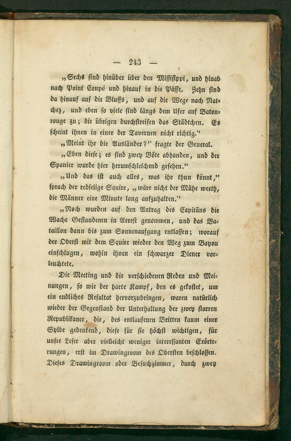 Die Meeting und die verſchiedenen Reden und Mei⸗ nungen, ſo wie der harte Kampf, den es gekoſtet, um ein endliches Reſultat hervorzubringen, waren natürlich wieder der Gegenſtand der Unterhaltung der zwey ſtarren Republikaner 2 die, des entlaufenen Britten kaum einer Sylbbe gedenkend, dieſe für ſie höchſt wichtigen, für unſre Leſer aber vielleicht weniger intereſſanten Erörte⸗ rungen, erſt im Drawingroom des Oberſten beſchloſſen. Dieſes Drawingroom oder Beſuchzimmer, durch zwey