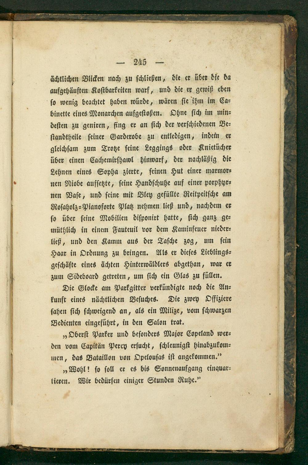 ächtlichen Blicken nach zu ſchließen, die er über die da aufgehäuften Koſtbarkeiten warf, und die er gewiß eben ſo wenig beachtet haben würde, wären ſie ihm im Ca⸗ binette eines Monarchen aufgeſtoßen. Ohne ſich im min⸗ deſten zu geniren, fing er an ſich der verſchiedenen Be⸗ ſtandtheile ſeiner Garderobe zu entledigen, indem er gleichſam zum Trotze ſeine Leggings oder Knietücher über einen Cachemirſhawl hinwarf, der nachläßig die Lehnen eines Sopha zierte, ſeinen Hut einer marmor⸗ nen Niobe aufſetzte, ſeine Handſchuhe auf einer porphyr⸗ nen Vaſe, und ſeine mit Bley gefüllte Reitpeitſche am Roſaholz⸗Pianoforte Platz nehmen ließ und, nachdem er ſo über ſeine Mobilien diſponirt hatte, ſich ganz ge⸗ müthlich in einem Fauteuil vor dem Kaminfeuer nieder⸗ ließ, und den Kamm aus der Taſche zog, um ſein Haar in Ordnung zu bringen. Als er dieſes Lieblings⸗ geſchäfte eines ächten Hinterwäldlers abgethan, war er zum Sideboard getreten, um ſich ein Glas zu füllen.