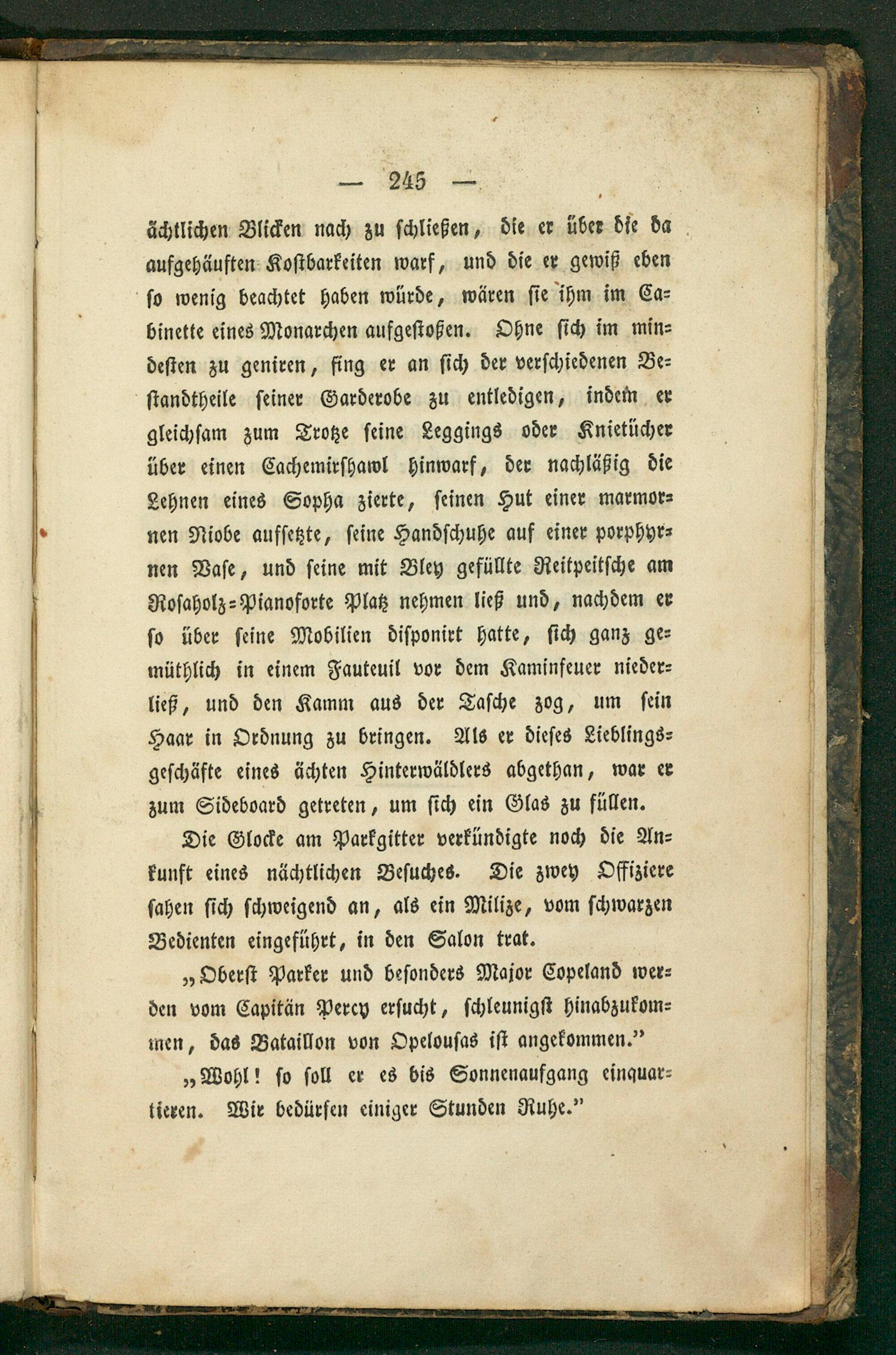 Die Glocke am Parkgitter verkündigte noch die An⸗ kunft eines nächtlichen Beſuches. Die zwey Offiziere ſahen ſich ſchweigend an, als ein Milize, vom ſchwarzen Bedienten eingeführt, in den Salon trat.