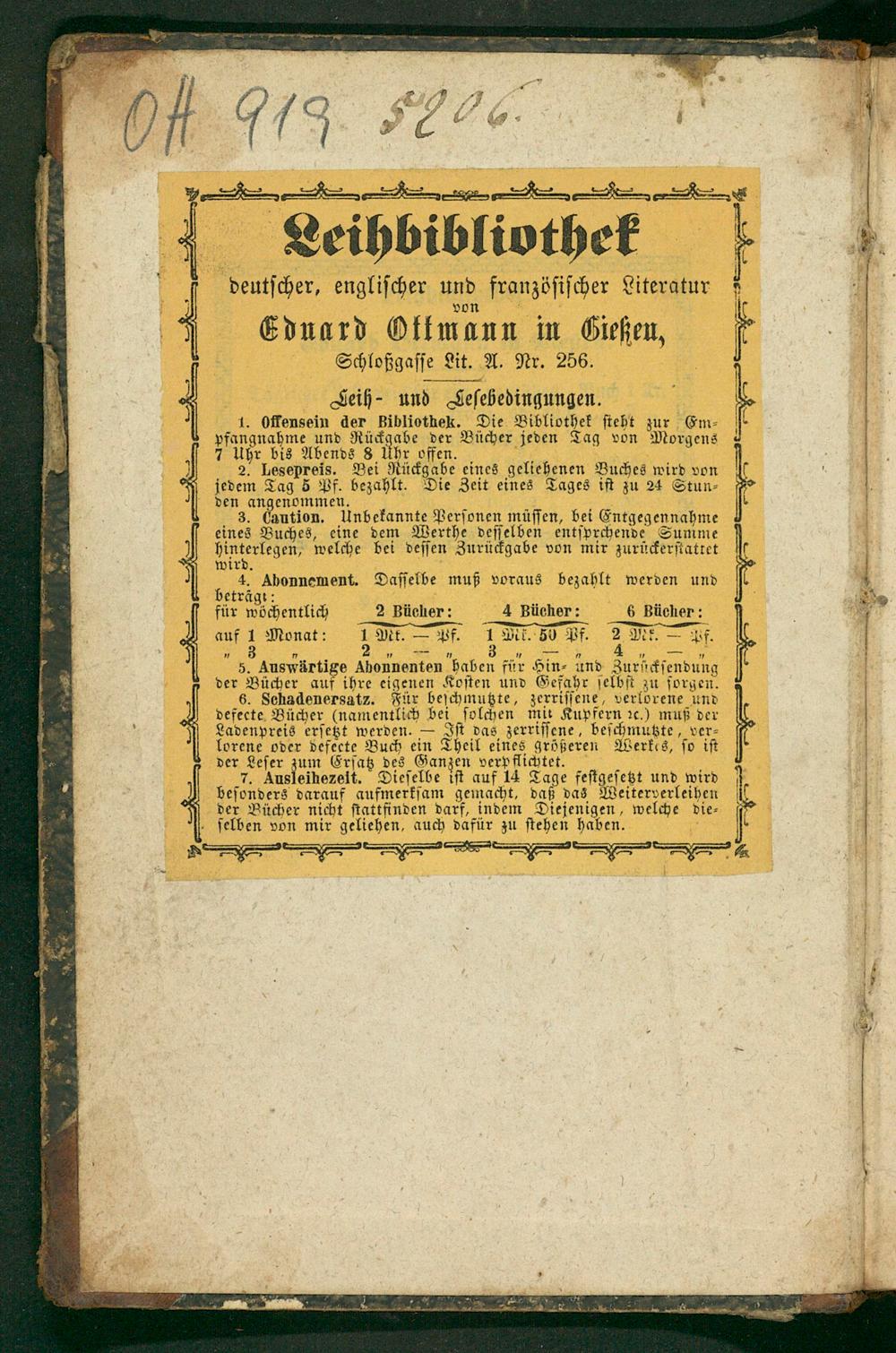 „/ 7 5 n. 1— 7„—„ 5. Auswärtige Abonnenten haben für Hin⸗ und Zurückſendung der Bücher auf ihre eigenen Koſten und Gefahr ſelbſt zu ſorgen. 6. Schadenersatz. Für beſchmutzte, zerriſſene, verlorene und defecte Bücher(namentlich bei ſolchen mit Kupfern ꝛc.) muß der Ladenpreis erſetzt werden.— Iſt das zerriſſene, Leſeheriatte„ver⸗ lorene oder defecte Buch ein Theil eines größeren der Leſer un Erſatz des Ganzen verpflichtet. 7. Ausleihezeit. Dieſelbe iſt auf 14 Tage feſtgeſetzt und wird beſonders darauf aufmerkſam gemacht, daß das Weiterverleihen