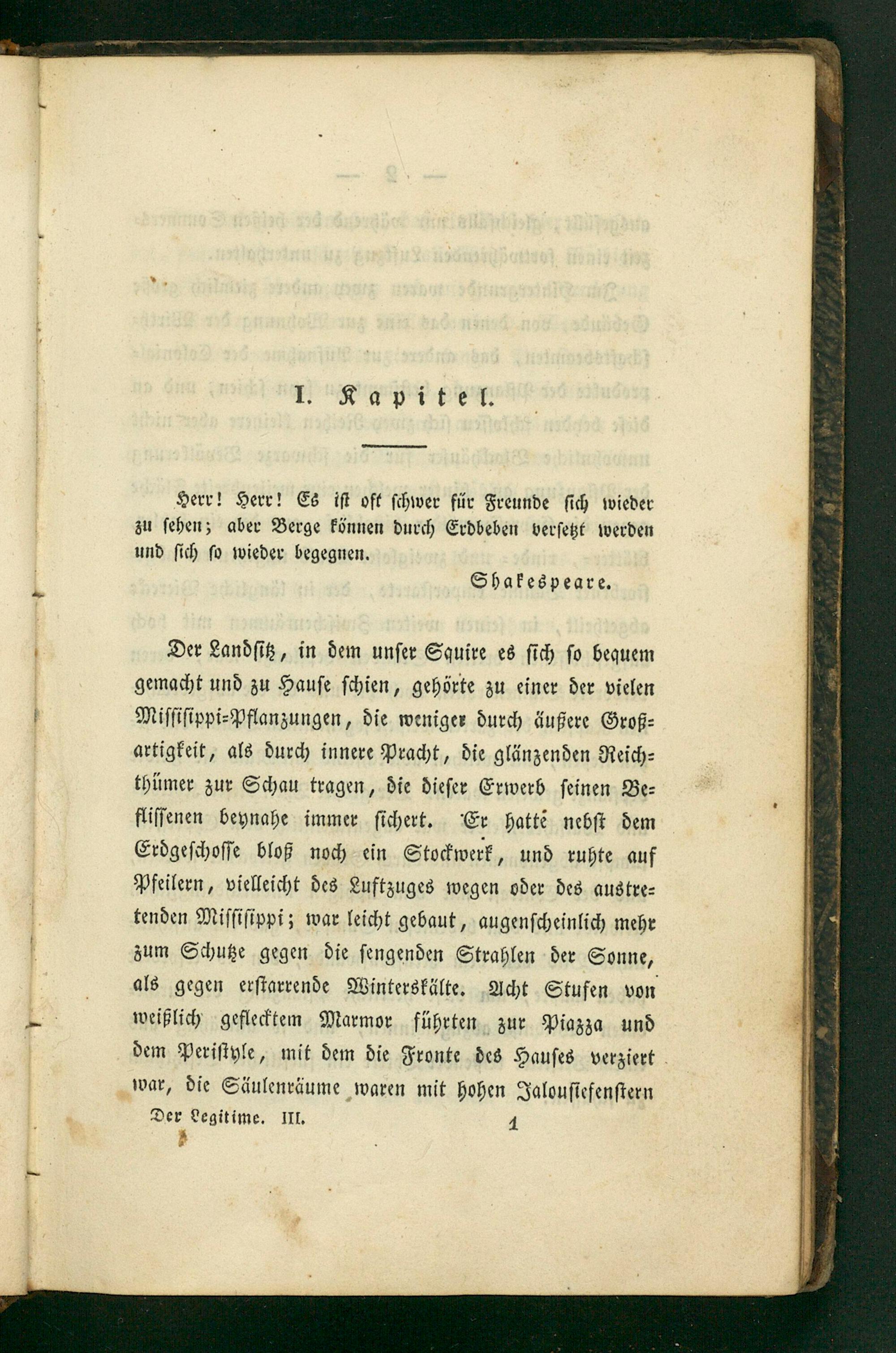 Der Landſitz, in dem unſer Squire es ſich ſo bequem gemacht und zu Hauſe ſchien, gehörte zu einer der vielen Miſſiſippi⸗Pflanzungen, die weniger durch äußere Groß⸗ artigkeit, als durch innere Pracht, die glänzenden Reich⸗ thümer zur Schau tragen, die dieſer Erwerb ſeinen Be⸗ fliſſenen beynahe immer ſichert. Er hatté nebſt dem Eroͤgeſchoſſe bloß noch ein Stockwerk, und ruhte auf Pfeilern, vielleicht des Luftzuges wegen oder des austre⸗ tenden Miſſiſtppi; war leicht gebaut, augenſcheinlich mehr zum Schutze gegen die ſengenden Strahlen der Sonne, als gegen erſtarrende Winterskälte. Acht Stufen von weißlich geflecktem Marmor führten zur Piazza und dem Periſtyle, mit dem die Fronte des Hauſes verziert