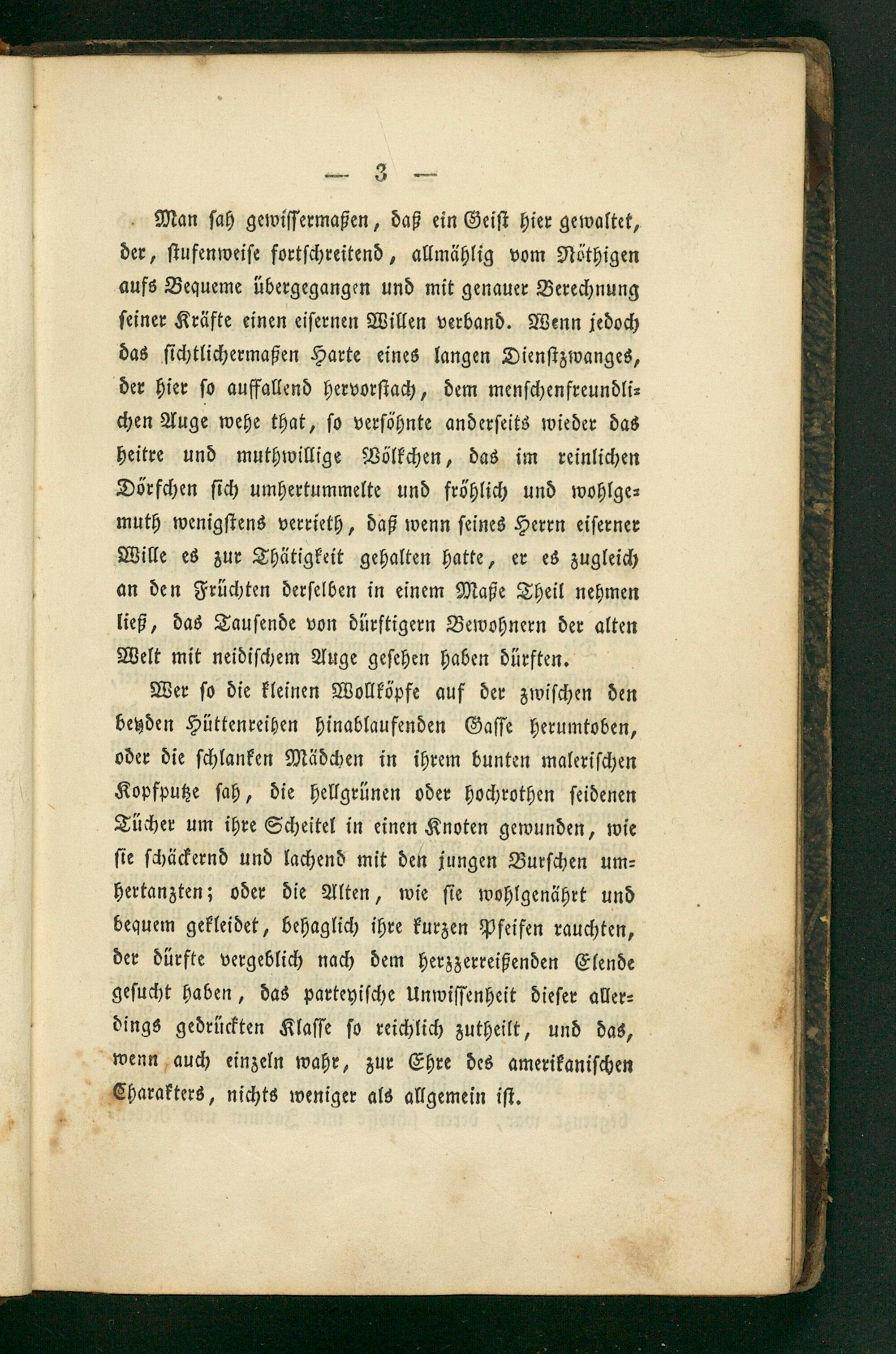 Man ſah gewiſſermaßen, daß ein Geiſt hier gewaltet, der, ſtufenweiſe fortſchreitend, allmählig vom Nöthigen aufs Bequeme übergegangen und mit genauer Berechnung ſeiner Kräfte einen eiſernen Willen verband. Wenn jedoch das ſichtlichermaßen Harte eines langen Dienſtzwanges, der hier ſo auffallend hervorſtach, dem menſchenfreundli⸗ chen Auge wehe that, ſo verſöhnte anderſeits wieder das heitre und muthwillige Völkchen, das im reinlichen Dörfchen ſich umhertummelte und fröhlich und wohlge⸗ muth wenigſtens verrieth, daß wenn ſeines Herrn eiſerner Wille es zur Thätigkeit gehalten hatte, er es zugleich an den Früchten derſelben in einem Maße Theil nehmen ließ, das Tauſende von dürftigern Bewohnern der alten Welt mit neidiſchem Auge geſehen haben dürften.