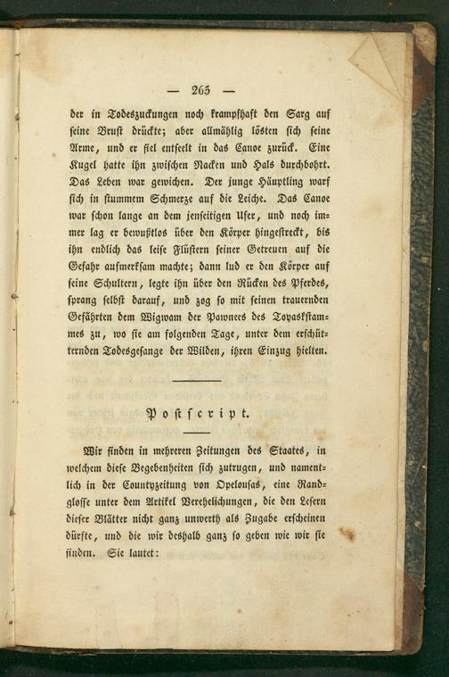 der in Todeszuckungen noch krampfhaft den Sarg auf ſeine Bruſt drückte; aber allmählig lösten ſich ſeine Arme, und er fiel entſeelt in das Canoe zurück. Eine Kugel hatte ihn zwiſchen Nacken und Hals durchbohrt. Das Leben war gewichen. Der junge Häuptling warf ſich in ſtummem Schmerze auf die Leiche. Das Canoe war ſchon lange an dem jenſeitigen Ufer, und noch im⸗ mer lag er bewußtlos über den Körper hingeſtreckt, bis ihn endlich das leiſe Flüſtern ſeiner Getreuen auf die Gefahr aufmerkſam machte; dann lud er den Körper auf ſeine Schultern, legte ihn über den Rücken des Pferdes, ſprang ſelbſt darauf, und zog ſo mit ſeinen trauernden Gefährten dem Wigwam der Pawnees des Tovaskſtam⸗ mes zu, wo ſie am folgenden Tage, unter dem erſchüt⸗ ternden Todesgeſange der Wilden, ihren Einzug hielten.