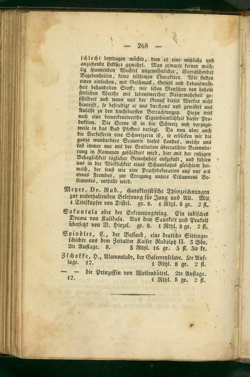ſchlecht beytragen möchte, dem es eine nützliche und anziehende Lektüre gewährt. Man erwarte keinen mäch⸗ tig ſpannenden Wechſel ungewöhnlicher, überraſchender Begebenheiten, keine ſeltſamen Charaktere. Wir finden einen einfachen, mit Geſchmack, Gefühl und Lebensweis⸗ heit behandelten Stoff; wir ſehen Menſchen von hohem ſittlichen Werthe mit lobenswerther Naturwahrheit ge⸗ ſchildert und wenn uns der Genuß dieſes Werkes nicht hinreißt, ſo befriedigt er uns durchaus und gewährt uns Anläſſe zu den fruchtbarſten Betrachtungen. Hiezu tritt noch eine bemerkenswerthe Eigenthümlichkeit dieſer Pro⸗ duktion. Die Scene iſt in die Schweiz und vorzugs⸗ weiſe in das Bad Pfeffers verlegt. Da nun aber auch die Verfaſſerin eine Schweizerin iſt, ſo erblicken wir die ganze wunderbare Scenerie dieſes Landes, welche uns faſt immer nur mit der Eraltation überraſchter Bewunde⸗ rung in Romanen geſchildert wird, hier mit der ruhigen Behaglichkeit täglicher Gewohnheit aufgefaßt, und fühlen uns in der Wirklichkeit eines Schauplatzes gleichſam hei⸗ miſch, der ſonſt wie eine Prachtdekoration uns nur als etwas Fremdes, zur Erregung unſers Erſtaunens Be⸗ ſtimmtes, enthüllt wird.