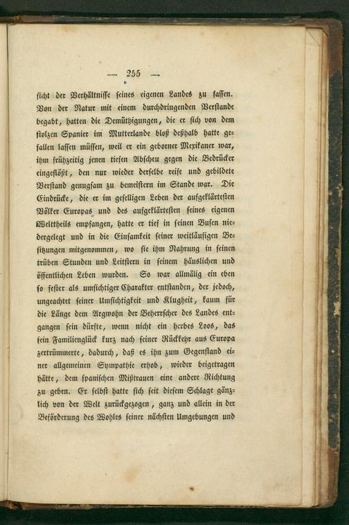 ſicht der Verhältniſſe ſeines eigenen Landes zu faſſen. Von der Natur mit einem durchdringenden Verſtande begabt, hatten die Demüthigungen, die er ſich von dem ſtolzen Spanier im Mutterlande bloß deßhalb hatte ge⸗ fallen laſſen müſſen, weil er ein geborner Mexikaner war, ihm frühzeitig jenen tiefen Abſcheu gegen die Bedrücker eingeflößt, den nur wieder derſelbe reife und gebildete Verſtand genugſam zu bemeiſtern im Stande war. Die Eindrücke, die er im geſelligen Leben der aufgeklärteſten Völker Europas und des aufgeklärteſten ſeines eigenen Welttheils empfangen, hatte er tief in ſeinen Buſen nie⸗ dergelegt und in die Einſamkeit ſeiner weitläufigen Be⸗ ſitzungen mitgenommen, wo ſie ihm Nahrung in ſeinen trüben Stunden und Leitſtern in ſeinem häuslichen und öffentlichen Leben wurden. So war allmälig ein eben ſo feſter als umſichtiger Charakter entſtanden, der jedoch, ungeachtet ſeiner Umſichtigkeit und Klugheit, kaum für die Länge dem Argwohn der Beherrſcher des Landes ent⸗ gangen ſein dürfte, wenn nicht ein herbes Loos, das ſein Familienglück kurz nach ſeiner Rückkehr aus Europa zertrümmerte, dadurch, daß es ihn zum Gegenſtand ei⸗ ner allgemeinen Sympathie erhob, wieder beigetragen hätte, dem ſpaniſchen Mißtrauen eine andere Richtung zu geben. Er ſelbſt hatte ſich ſeit dieſem Schlage gänz⸗ lich von der Welt zurückgezogen, ganz und allein in der Beförderung des Wohles ſeiner nächſten Umgebungen und