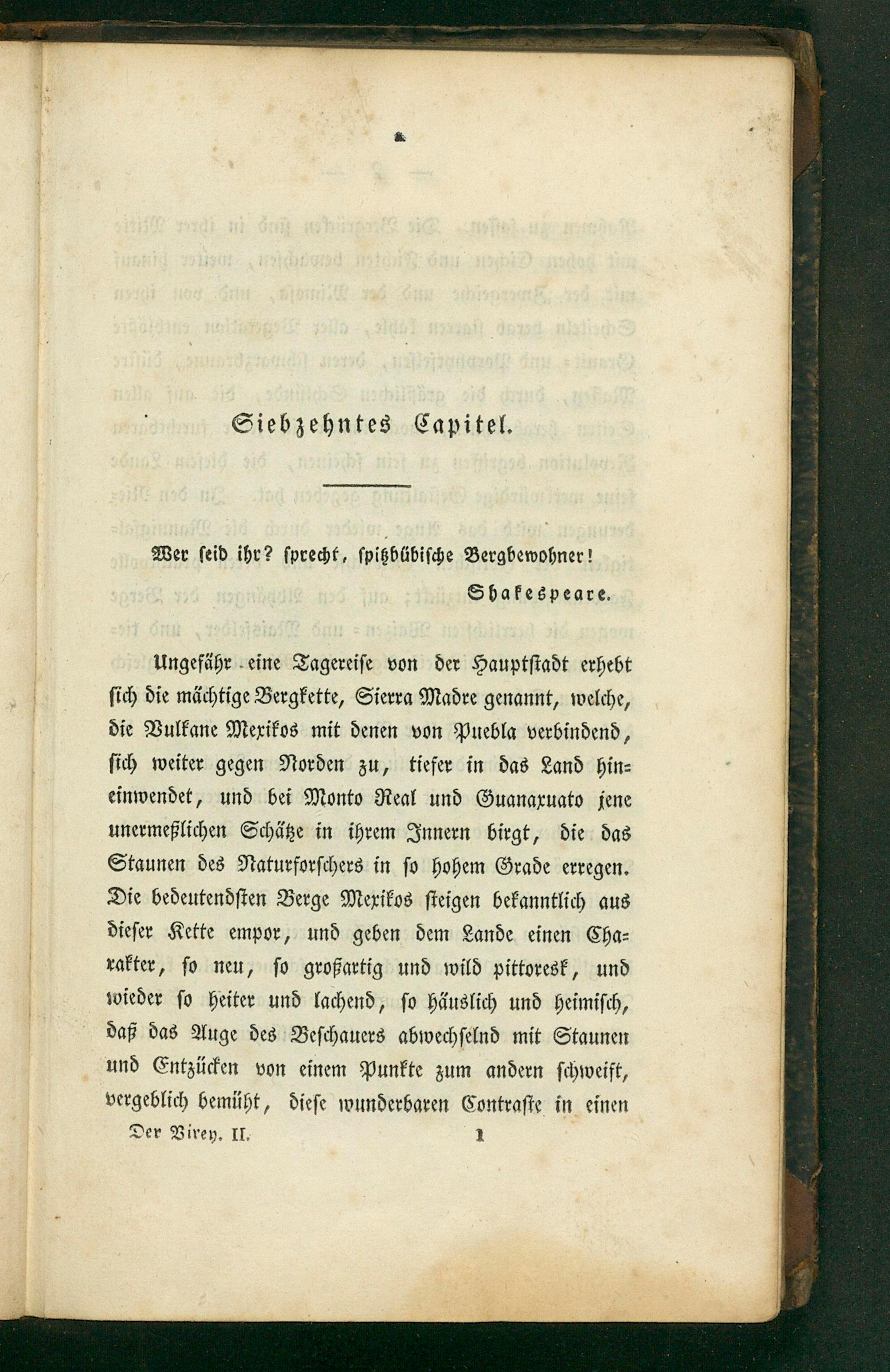 Ungefähr eine Tagereiſe von der Hauptſtadt erhebt ſich die mächtige Bergkette, Sierra Madre genannt, welche, die Vulkane Mexikos mit denen von Puebla verbindend, ſich weiter gegen Norden zu, tiefer in das Land hin⸗ einwendet, und bei Monto Real und Guanaxuato jene unermeßlichen Schätze in ihrem Innern birgt, die das Staunen des Naturforſchers in ſo hohem Grade erregen. Die bedeutendſten Berge Mexikos ſteigen bekanntlich aus dieſer Kette empor, und geben dem Lande einen Cha⸗ rakter, ſo neu, ſo großartig und wild pittoresk, und wieder ſo heiter und lachend, ſo häuslich und heimiſch, daß das Auge des Beſchauers abwechſelnd mit Staunen und Entzücken von einem Punkte zum andern ſchweift,